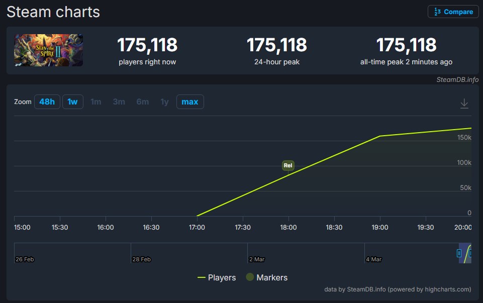 SteamDB'den alınan verilere göre, oyun yayınlandıktan sadece birkaç saat sonra Steam'de 175.000'in üzerinde eş zamanlı oyuncuya ulaştı. Bu, özellikle bir erken erişim oyunu için çok güçlü bir başlangıç. Karşılaştırma yapmak gerekirse, orijinal Slay the Spire yaklaşık üç ay önce 57.025 oyuncuyla en yüksek oyuncu sayısına ulaşmıştı. Bu da devam oyununun, piyasaya sürüldükten sadece birkaç saat sonra selefinin zirvesini neredeyse üç kat aştığı anlamına geliyor.