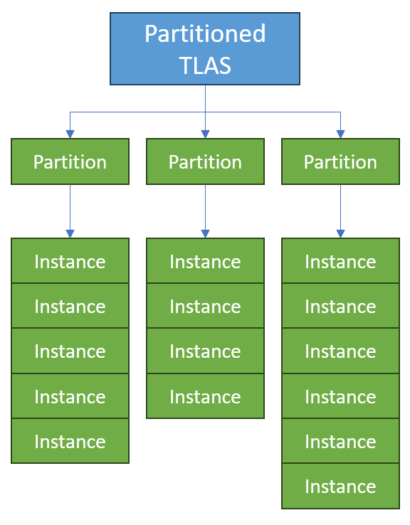 Bölümlendirilmiş TLAS, kümelenmiş geometride kullanılan aynı metodolojiyi alır ve oyun sahnesine uygular. Bu durumda, tüm oyun sahnesi, GPU'nun yeni ışın izleme öğeleriyle daha kolay işleyebileceği daha küçük gruplara bölünebilir. GPU, tüm sahneden yalnızca görünür veya gerekli öğeleri ışınla izleyebildiğinden bu, ışın izleme performansını önemli ölçüde hızlandırır.