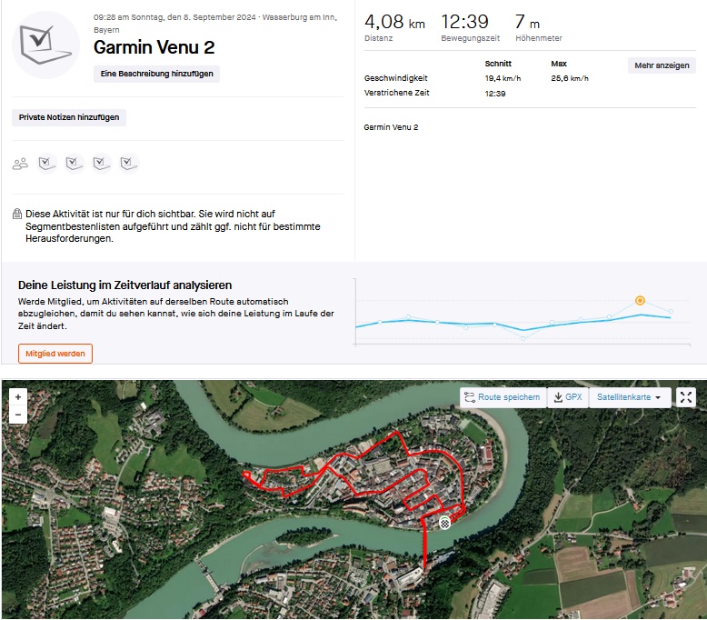 Konum doğruluğunu belirlemek için Motorola telefon üzerinde gerçek hayat testimizi gerçekleştirdik: Yanımızda bir karşılaştırma cihazı olan Garmin Venu 2 akıllı saati de getirdiğimiz bir bisiklet gezisi. Edge 50 Neo genellikle gerçek rotadan yaklaşık yarım metre saptı, ancak bunun dışında çok doğruydu ve dar eski şehir sokaklarında bile konumumuzu takip etmeyi başardı. Kesinlikle kesin konum doğruluğuna ihtiyaç duymayan herkes akıllı telefonla iyi bir navigasyon gerçekleştirebilecektir.