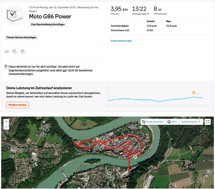 Açık havada Moto G86 Power, konumunu yaklaşık üç metreye kadar hızlı bir şekilde sabitliyor. Bisiklet testimiz sırasında konum doğruluğu zaman zaman biraz şaştı, ancak akıllı telefon günlük navigasyon için hala yeterince doğru.