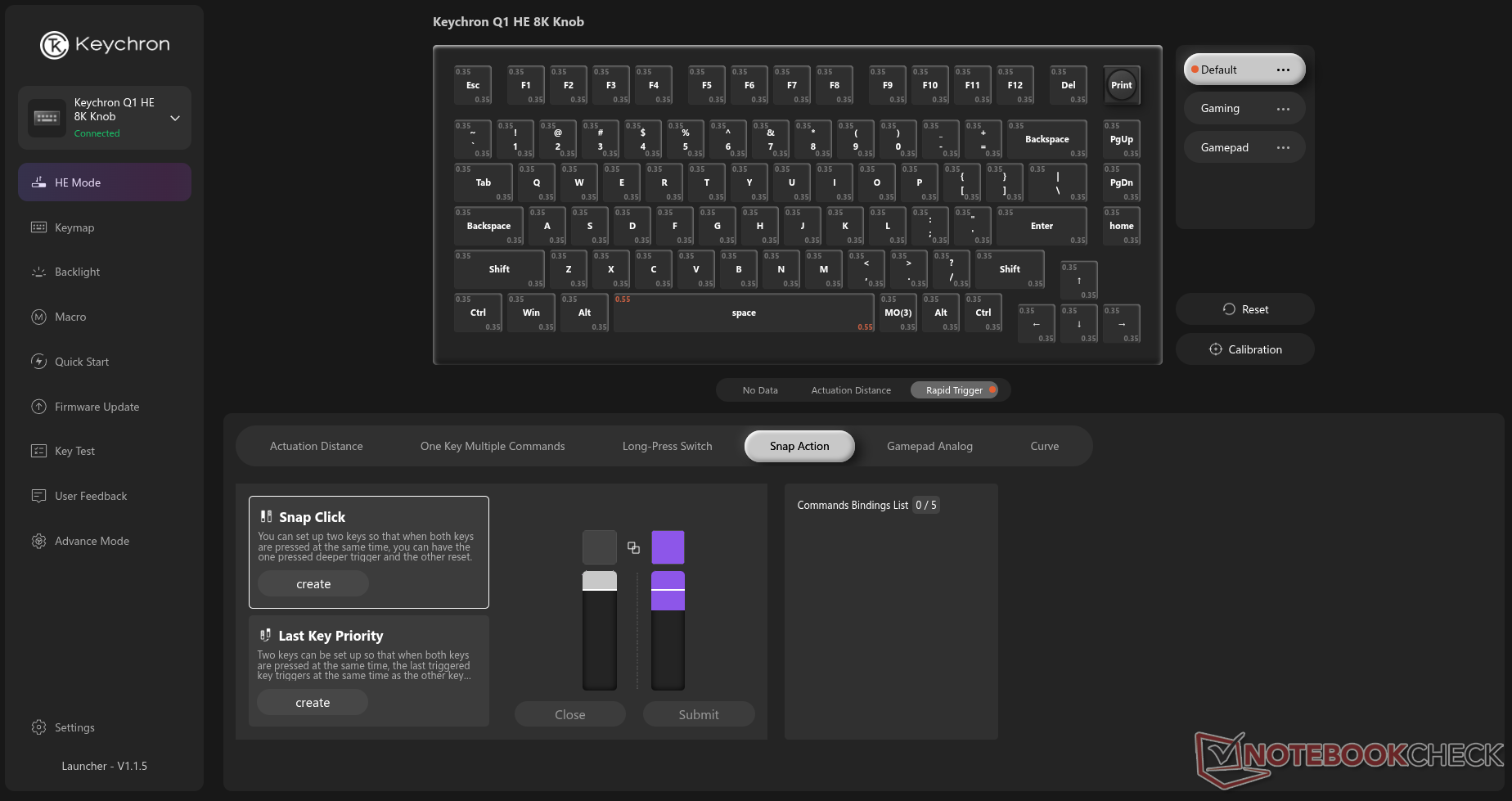 Bu eksik özelliğin yanı sıra, Keychron Launcher, özellikle herhangi bir şey yüklemeyi gerektirmediği ve tamamen bir tarayıcıda çalıştığı göz önüne alındığında, hala mükemmel bir özelleştirme paketidir. Başlatıcı ayrıca üç adet özelleştirilebilir profile izin verirken, her profil bir dizi çalıştırma mesafesi ve analog giriş ayarını kaydediyor ve bunlardan biri kontrol cihazı emülasyonu için önceden yapılandırılmış. Q1 HE 8K'da, diğer Keychron HE klavyelerdeki bağlantı anahtarı, şaşırtıcı derecede kullanışlı olan bir donanım profili anahtarı olarak yeniden tasarlanmıştır.