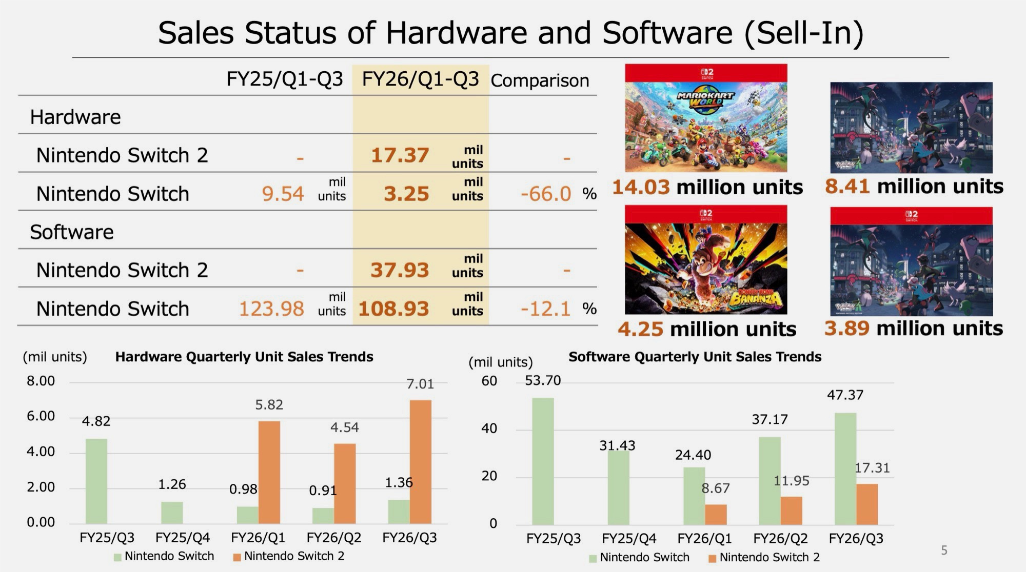 Mario Kart World 14,03 milyon kopya satışıyla açık ara en çok satan oyun olurken, onu Pokémon Legends takip etti: Z-A 12,3 milyon ile takip etti. Her iki oyun da büyük olasılıkla resmi konsol paketlerine dahil edilmekten yararlandı. İlginç bir şekilde, teknik sorunlarına rağmen (aşağıdaki Digital Foundry videosunda tartışılmıştır), orijinal Switch sürümü Pokémon Legends'ın 8,41 milyon adet satışını gerçekleştirmiştir: Z-A'nın toplam satışlarının 8,41 milyonunu oluşturdu