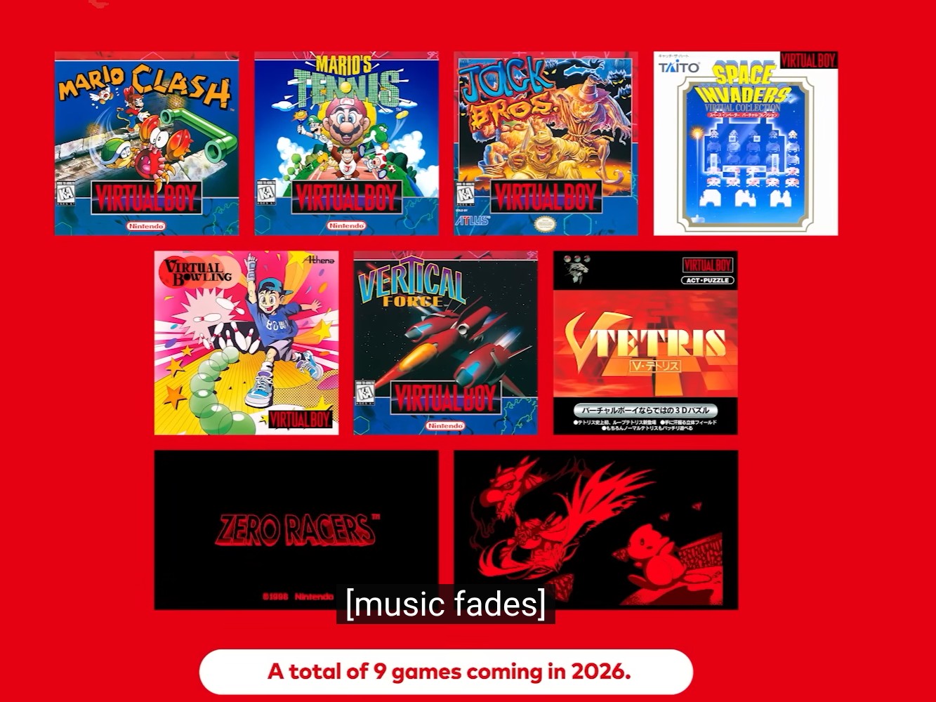 Nintendo'nun yıl içinde ekleneceğini söylediği diğer oyunlar arasında Mario Clash, Mario Tennis, Jack Bros, Space Invaders Virtual Collection, Virtual Bowling, Vertical Force ve V-Tetris yer alıyor. Nintendo ayrıca Virtual Boy ilk olarak 1995 yılında piyasaya sürüldüğünde orijinal olarak piyasaya sürülmemiş olan ek oyunları da piyasaya sürecek. Bu oyunlar Zero Racers ve D-Hopper'dır ve bu yıl da piyasaya sürüleceklerdir.