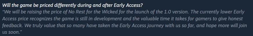 Mahler'e göre, No Rest for the Wicked 'ın fiyatı Erken Erişim'den çıktıktan sonra "premium bir oyun" olduğu için 40 dolardan 60 dolara yükselecek Fiyat artışı daha önce onaylanmıştı ve oyunun Steam sayfasında açıkça belirtilmişti.