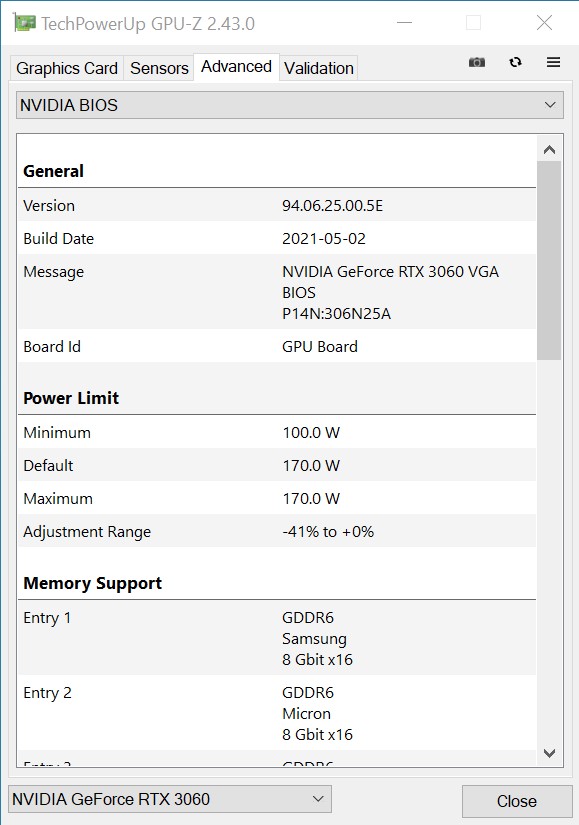 Başta belirtildiği gibi, INNO3D GeForce RTX 3060 Twin X2'nin saat hızları Nvidia'nın “Founders Edition” versiyonu ile aynı seviyede. Aynı durum, tüm grafik kartı için 170 watt olan güç sınırı için de geçerlidir. Ayrıca, test örneğimizde güç hedefi daha fazla artırılamaz. Böylece maksimum 170 watt'ta kalıyor ve bu da hız aşırtma potansiyelini bir şekilde sınırlandırıyor.