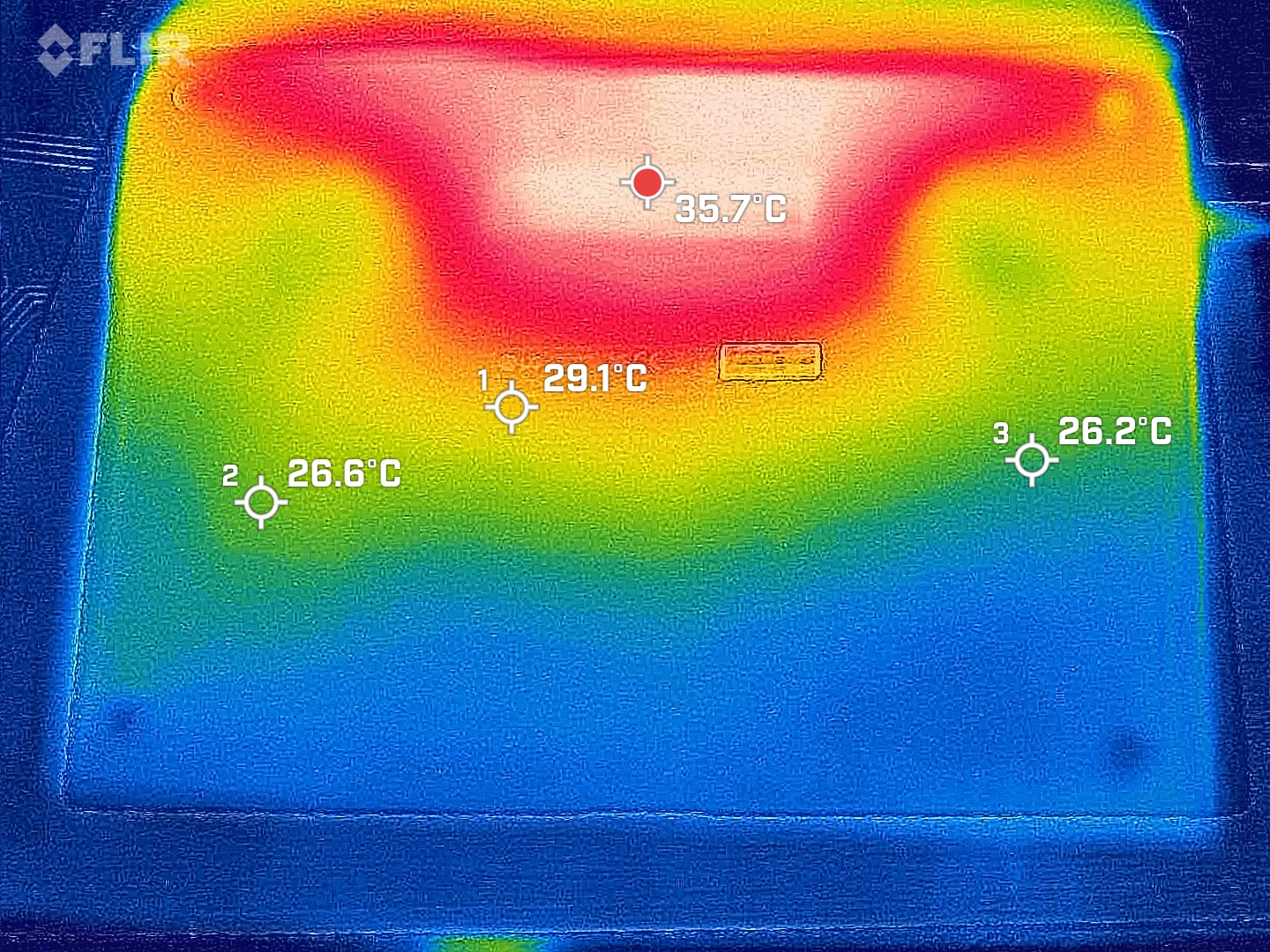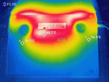 Daha önce de belirtildiği gibi LG Gram Pro 2'si 1 aradatest cihazının üzerindeki mat siyah boya, temassız termometrelerimizin arızalanmasına ve önemli ölçüde daha yüksek sıcaklıklar göstermesine neden oluyor. Bu nedenle Flir One Pro kullanarak sıcak noktaları aradık ve bunları Fluke t3000 FC ile K-Tipi termoproblar kullanarak ölçtük. Bir dGPU'ya sahip olmasına rağmen, Gram Pro 16'da yakın zamanda test ettiğimiz dönüştürülebilir cihazdan biraz daha düşük sıcaklıklar bulduk. Genel olarak, sıcak noktaların hiçbiri 50 °C sınırına ulaşmadı. Dizüstü bilgisayar, stres testi sırasında bile sıcaklıklarını tolere edilebilir bir seviyede tuttu.