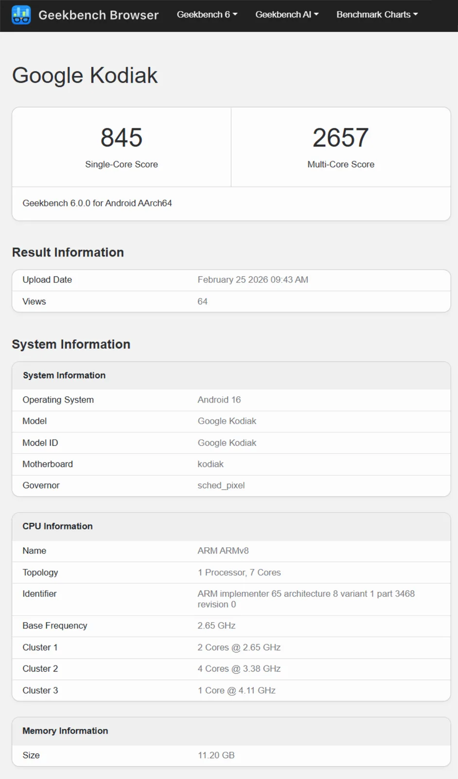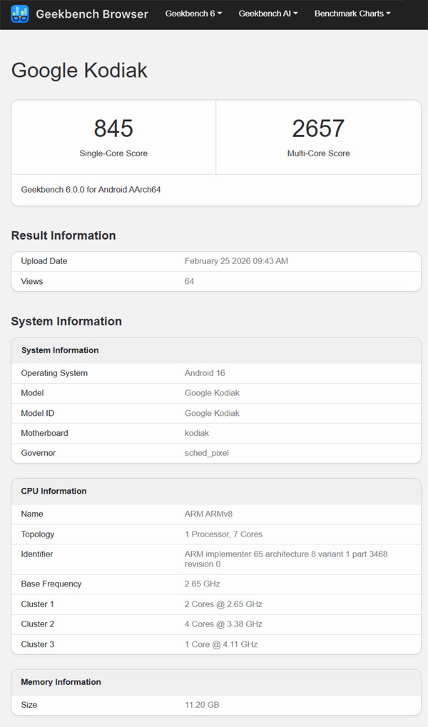Şimdi, sızdırılan bir Geekbench listesi, Google'ın yakında çıkacak Pixel 11 serisi için alışılmadık bir çıkış planladığını gösteriyor. Her zaman olduğu gibi, kıyaslama platformu perakende bir isim vermiyor. Bununla birlikte, 'Google Kodiak' zaten kurulmuş için kod adı olarak Pixel 10 Pro XL.