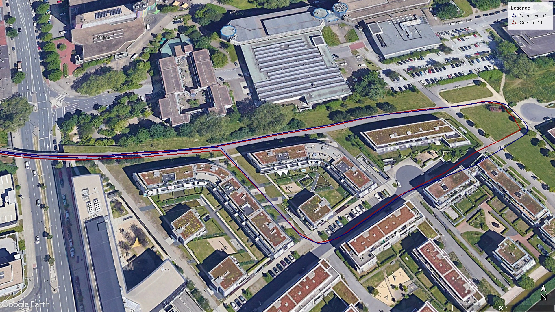 Telefonun uydular aracılığıyla konumlandırma doğruluğunu değerlendirmek için kendimize kısa bir bisiklet sürüşü izni veriyoruz ve karşılaştırma cihazı olarak Garmin Venu 2'yi yanımıza alıyoruz. OnePlus 13'ün konumlandırması çift bantlı GNSS kullanılarak belirleniyor. Uyduyu çok hızlı bir şekilde tespit edebildik ve GNSS modülü binaların içinde de son derece hassas.