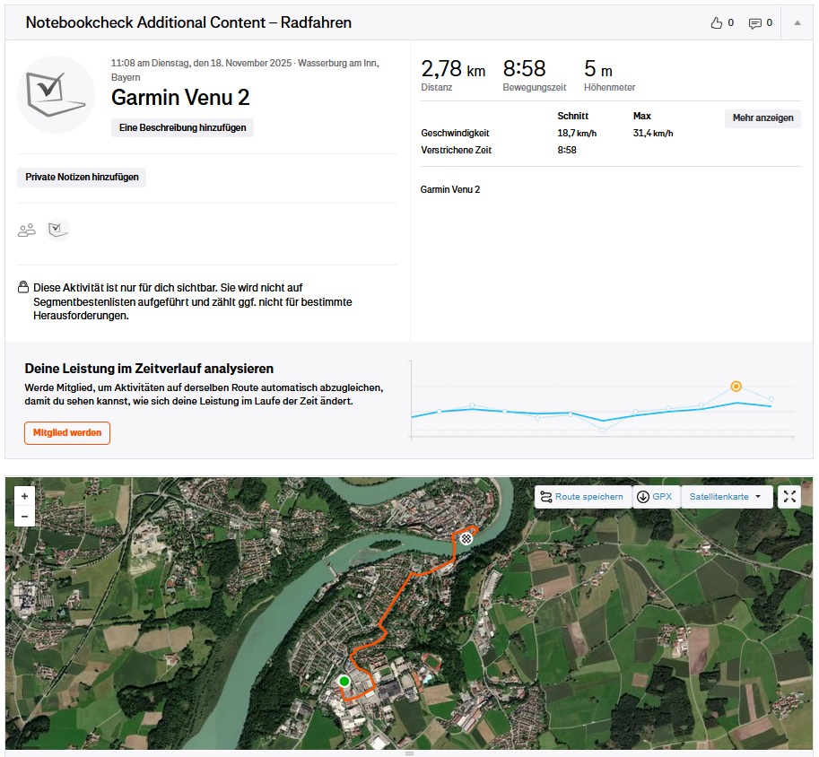 Konumlandırmayı bir bisiklet gezisinde gerçek yaşam koşullarında test etmeyi amaçladık. Buna ek olarak, çok hassas konumlandırmaya sahip bir akıllı saat olan Garmin Venu 2'yi de kullandık.