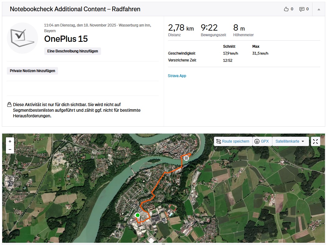 Her iki cihaz da tam olarak aynı mesafeyi hesapladı ve OnePlus 15 rotamızı doğru bir şekilde temsil etti. Köprüde, gerçek yolumuzdan birkaç metre uzağa yerleştirildik, ancak genel olarak, telefon navigasyon ve konum takibi için çok uygun.