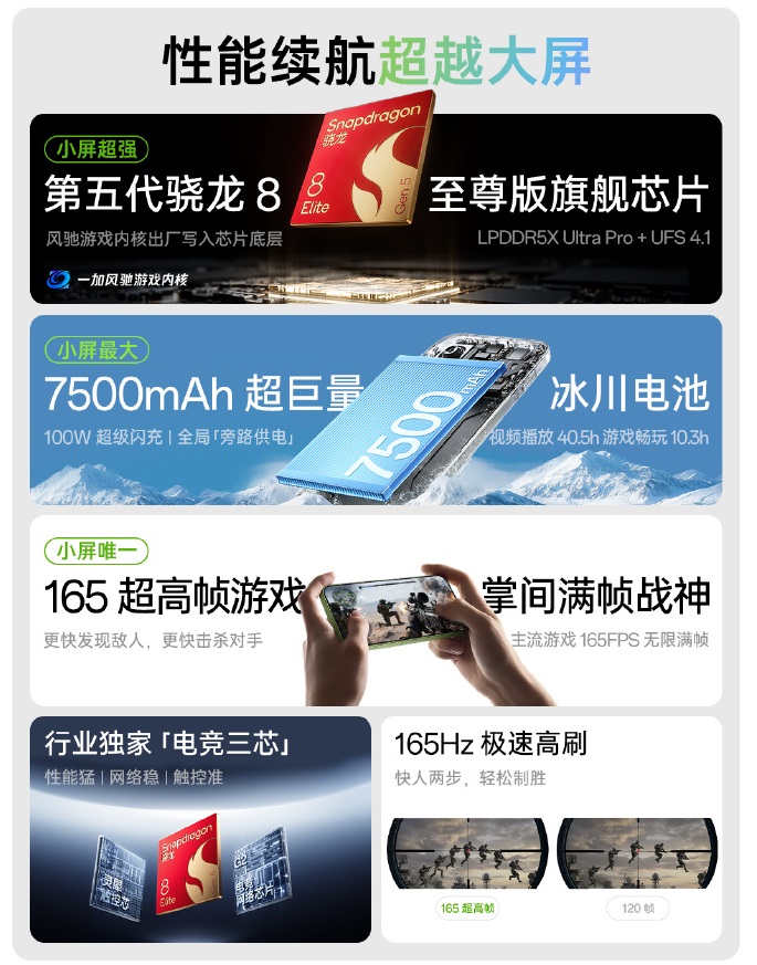 OnePlus 15T, kendisinden önceki 13T gibi 6,32 inçlik bir cihaz ve söz konusu ekran Tianma tarafından üretilen 165 Hz OLED. OnePlus 15T'nin kaputunun altında Snapdragon 8 Elite Gen 5daha büyük ve daha pahalı OnePlus 15'te olduğu gibi. Qualcomm yonga setine 16 GB'a kadar LPDDR5X Ultra Pro bellek ve 1 TB UFS 4.1 depolama alanının yanı sıra SUPERVOOC S güç yongası ve G2 E-spor ağ çipi.