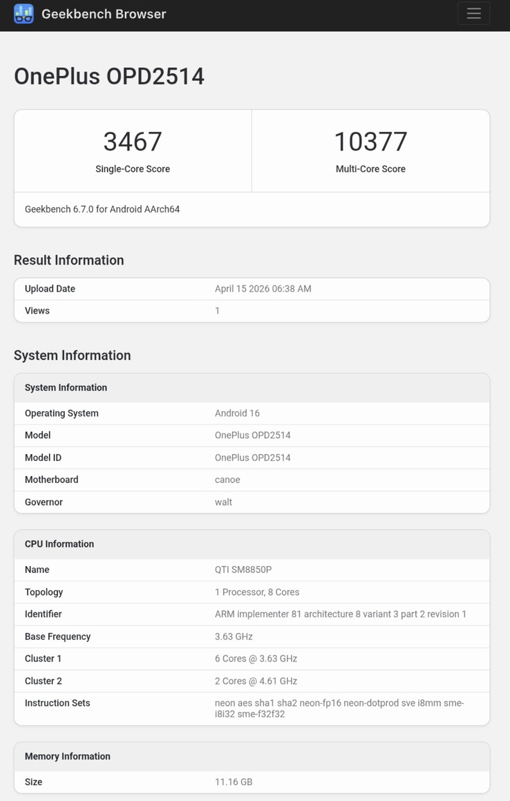 Bununla birlikte, OnePlus'ın yeni tableti gibi görünen şey şimdi Geekbench'te ortaya çıktı. Aşağıda yer alan 3.467'lik tek çekirdekli skor, cihazdan beklediğimiz skorun alt sınırında yer alıyor Snapdragon 8 Elite Gen 5 yonga seti. Aslında, bu erken skor, söylentilere göre Pad 3 Pro'nun daha küçük olan OnePlus 15. Aynı şekilde, tabletin 10.395'lik çok çekirdekli skoru onu Geekbench 6 çok çekirdekli liderlik tablomuzda ikinci sıraya yerleştirecektir.
