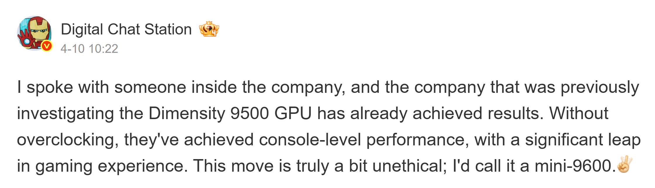Üretken sızıntı, şirketin Dimensity 9500'ün GPU'sunu incelediğini ve iyi sonuçlar elde ettiğini bildiriyor. Bu değiştirilmiş GPU ARM Mali G1- Ultra MC12görünüşe göre herhangi bir hız aşırtma olmadan "konsol düzeyinde" performans sunabilir.