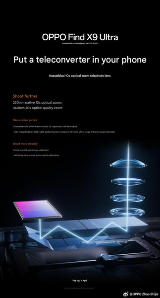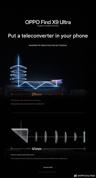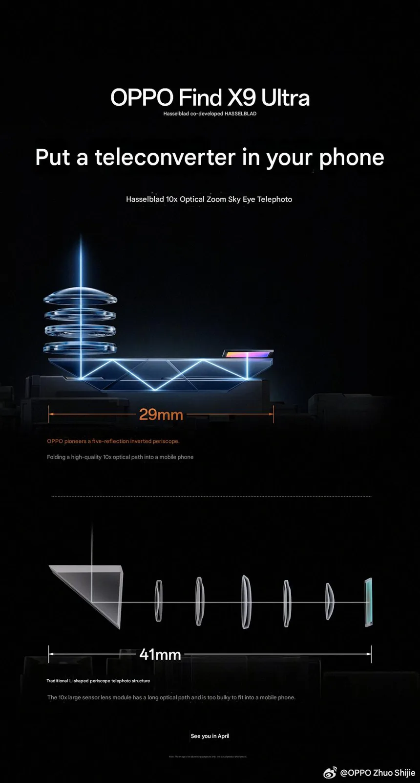 Oppo ilk kez resmi tanıtımlarını Weibo'da paylaştı ve X üzerinde Pete Lau aracılığıyla https://x.com/PeteLau/status/2036363387396038963 entegre 10x zoom modülünü sergilemek için Çin'e gitti. Çin'de şirket, sistemin tasarımına ve çalışma prensiplerine oldukça ayrıntılı bir bakış sağladı. Oppo, 230 mm eşdeğer odak uzaklığında üstün optik performans elde etmek için beş yansımalı, W şeklinde bir ışık yoluna sahip, sadece 29 mm uzunluğunda yeni bir ayna düzeneği dahil etti