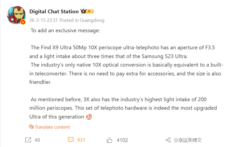 Tanınmış sızıntı kaynağı Digital Chat Station geçtiğimiz günlerde yeni ayrıntıları paylaştı find X9 Ultra'nın kamera donanımı hakkında. 10x periskop telefoto lensi muhtemelen 1/2.76 inç ISOCELL JN5 ile herhangi bir sensör yarışmasını kazanamayacak olsa da, kameranın nispeten geniş bir f/3.5 diyafram açıklığına sahip olduğu söyleniyor. Karşılaştırma için, Samsung'un önceki 10x telefoto lensi - en son Galaxy S23 Ultra - önemli ölçüde daha küçük bir 1/3.52 inç sensör ve çok daha dar bir f/4.9 diyafram açıklığı kullanıyor. Tam olarak söylemek gerekirse, Hasselblad markalı yeni telefoto kamera, Samsung'un daha önceki 10x telefoto lensinden (230 mm) 3,24 kat daha hızlı.