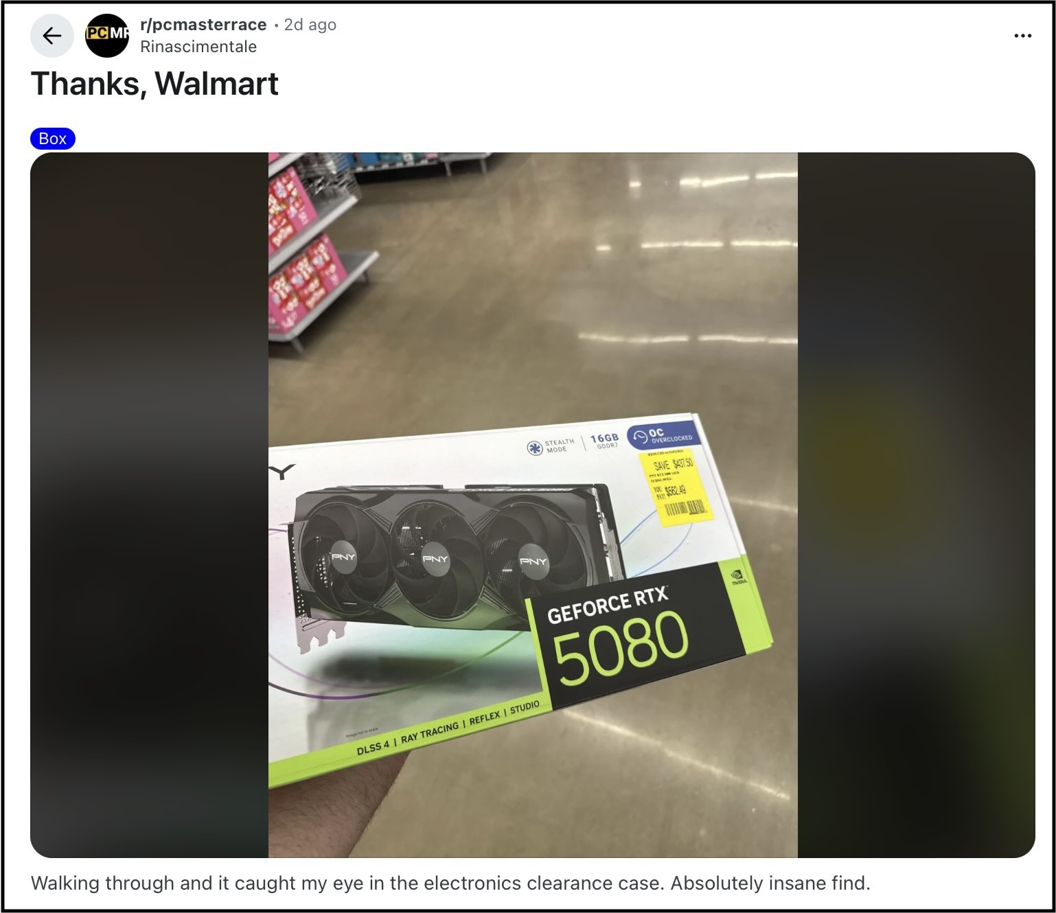 Ancak, daha önce de bildirdiğimiz gibi, çok sayıda meraklı ve oyuncu şok edici bir şekilde iyi fırsatlar i̇kinci el mağazaları ve indirimli satışlar sayesinde oyun donanımı konusunda. Böyle bir oyuncu yerel Walmart mağazasından sadece 562 dolara PNY RTX 5080 üç fanlı bir kart almayı başarmış görünüyor.
