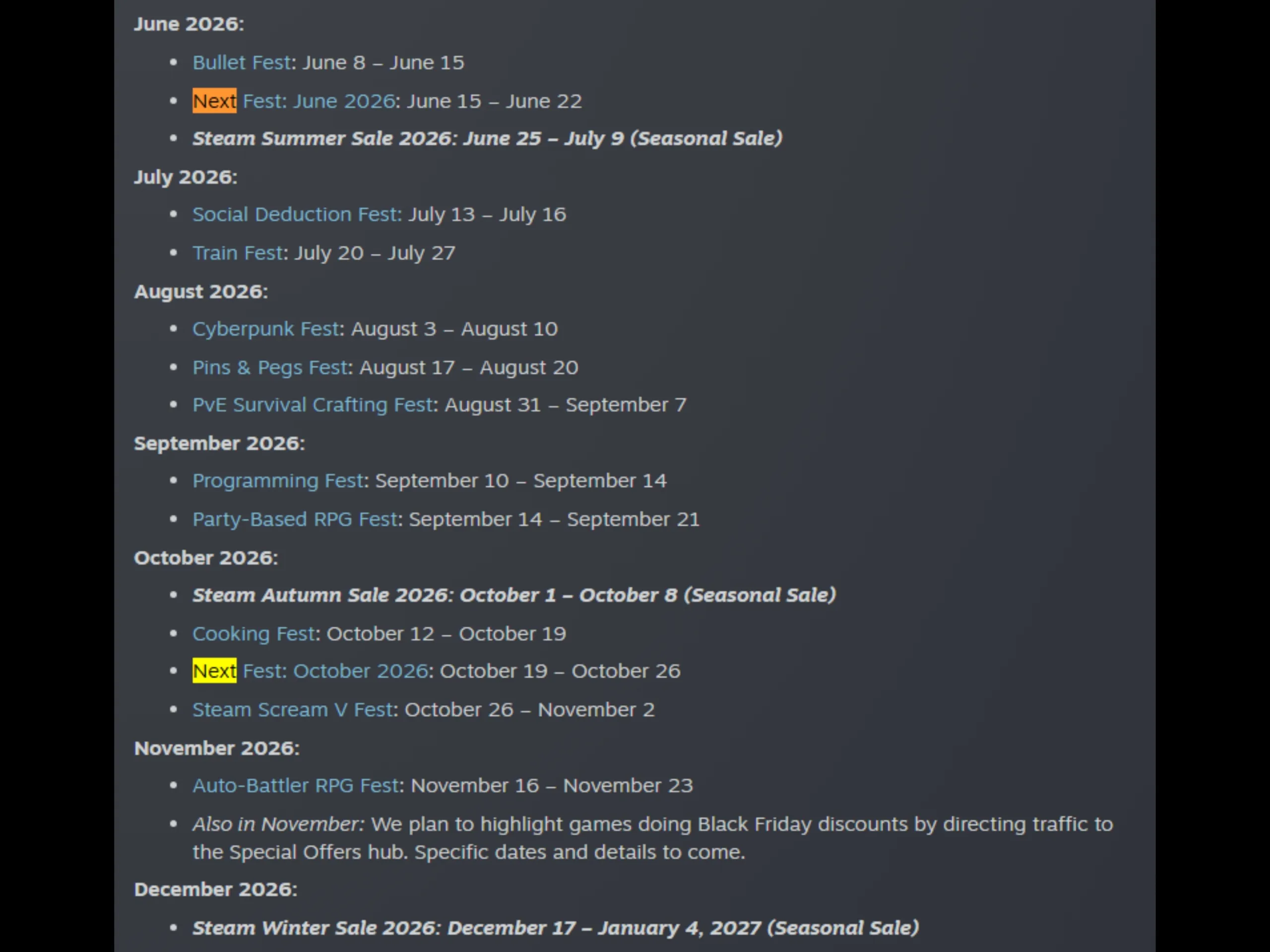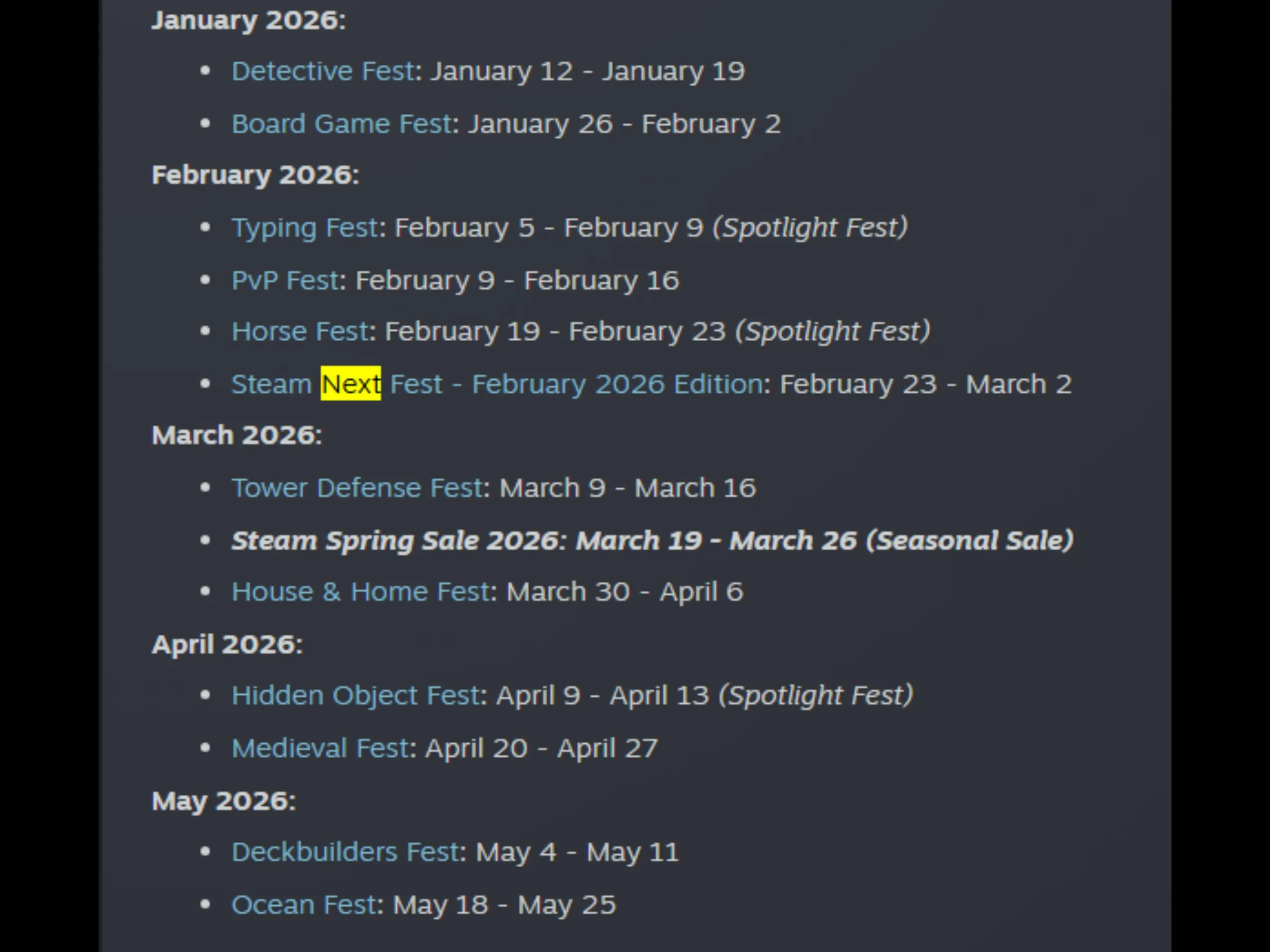 Neredeyse her türde indirim sunan dört büyük sezonluk indirime ek olarak, Steam yıl boyunca belirli kategorileri öne çıkaran çeşitli küçük temalı etkinliklere de ev sahipliği yapıyor. Örneğin, çok çeşitli dijital masa oyunlarında fırsatlar sunan Board Game Fest 26 Ocak'ta başlıyor. Bunu Şubat başında klavye tabanlı oyunlara odaklanan Typing Fest takip ediyor. Bir diğer önemli etkinlik ise bu yıl Şubat, Haziran ve Ekim aylarında olmak üzere üç kez düzenlenen Steam Next Fest. Diğer etkinliklerin aksine, bu etkinlik indirimlere odaklanmıyor, bunun yerine ücretsiz demoları ve gelecek oyunların geliştirici önizlemelerini öne çıkarıyor. 2026'da planlanan tüm Steam etkinliklerinin tam bir özetini aşağıda bulabilirsiniz: