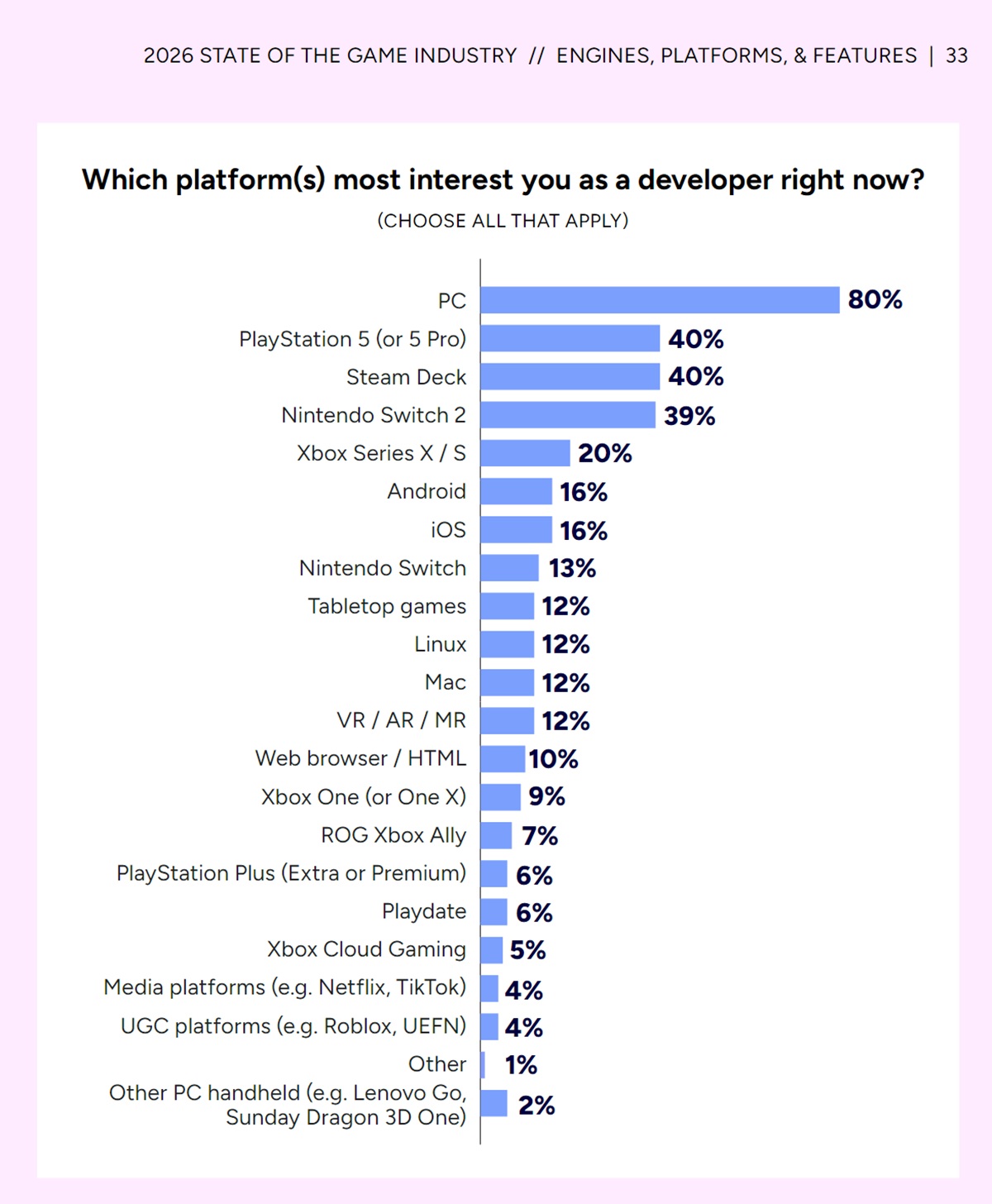 As Video Games Chronicle 2300'ün üzerinde oyun endüstrisi profesyonelinin katıldığı GDC anket. Bir soruda "Şu anda bir geliştirici olarak en çok hangi platform(lar) ilginizi çekiyor?" diye soruldu Katılımcıların birden fazla seçim yapmasına izin verildiğinde, %80'lik bir oranla PC açık ara birinci oldu. PS5 ve Buhar Güvertesi ardından %40 ile Switch 2 ve %39 ile Xbox Series X|S %20 ile geliyor.