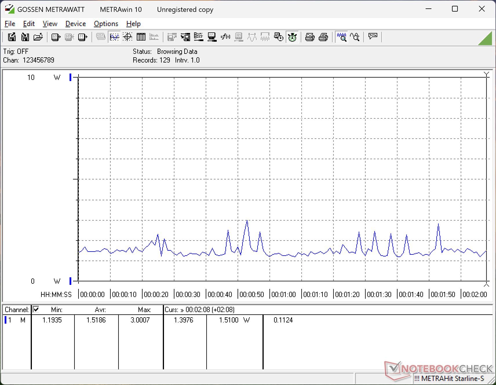 Aşağıdaki grafik, XPS 16 FHD+ konfigürasyonunun masaüstünde en düşük parlaklık ayarında ve VRR etkinken rölantide çalışırken iki dakikalık bir süre boyunca güç tüketimini göstermektedir. Sistem ortalama sadece 1,5 W gücünde ki bu da 16 inçlik büyük bir ekran boyutu için oldukça etkileyici. Gibi rakip modeller Asus ZenBook S16 veya MSI Prestige 16 benzer koşullar altında her biri 3 W ila 5 W arasında çekecektir.