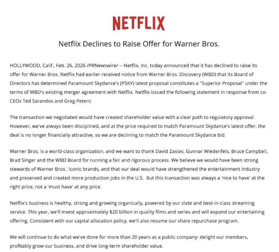 5 Aralık 2025'te, Netflix yayınladığı resmi duyuruda, yayın platformunun film ve televizyon stüdyoları, HBO Max ve HBO dahil olmak üzere Warner Bros'u satın almak için kesin bir anlaşmayı tamamen müzakere ve finanse ettiğini açıkladı. Nakit ve hisse senedi işleminin değeri 82.7 milyar dolardı (öz sermaye değeri 72 milyar dolar). Ancak bu aslında kesin bir anlaşma değildi, çünkü WBD için teklif verme süreci açık kaldı ve Paramount Skydance bu arada teklif vermeye devam etti. 26 Şubat'ta Warner Bros Discovery yönetim kurulu Paramount'un son teklifini ilk Netflix anlaşmasından "daha üstün" buldu. Bu daha yüksek teklif, Paramount Skydance'ın WBD'nin %100'ünü yaklaşık 111 milyar dolar karşılığında satın almasını öngörüyordu. Netflix daha yüksek bir teklifle karşılık vermeyi reddetti ve Paramount şimdi WBD'ye tamamen sahip olmaya hazır görünüyor.
