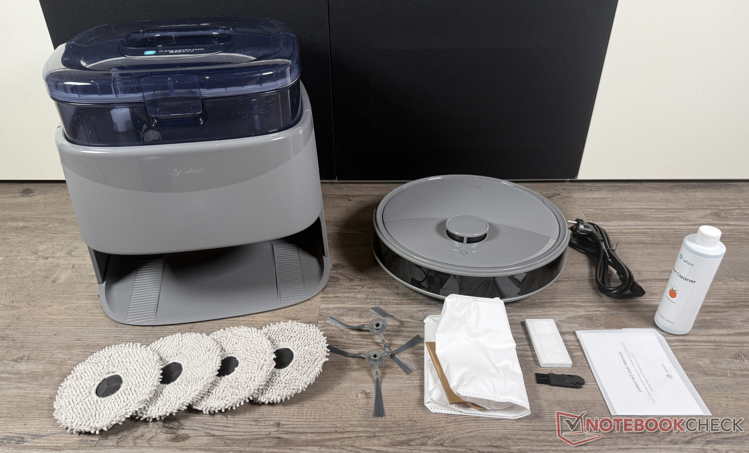 Lefant küçük bir şişe temizlik maddesi içerir. Ayrıca, zorunlu hızlı başlangıç kılavuzunun yanı sıra yedek bir toz torbası, iki ek bez ve ikinci bir yan fırça dahildir.