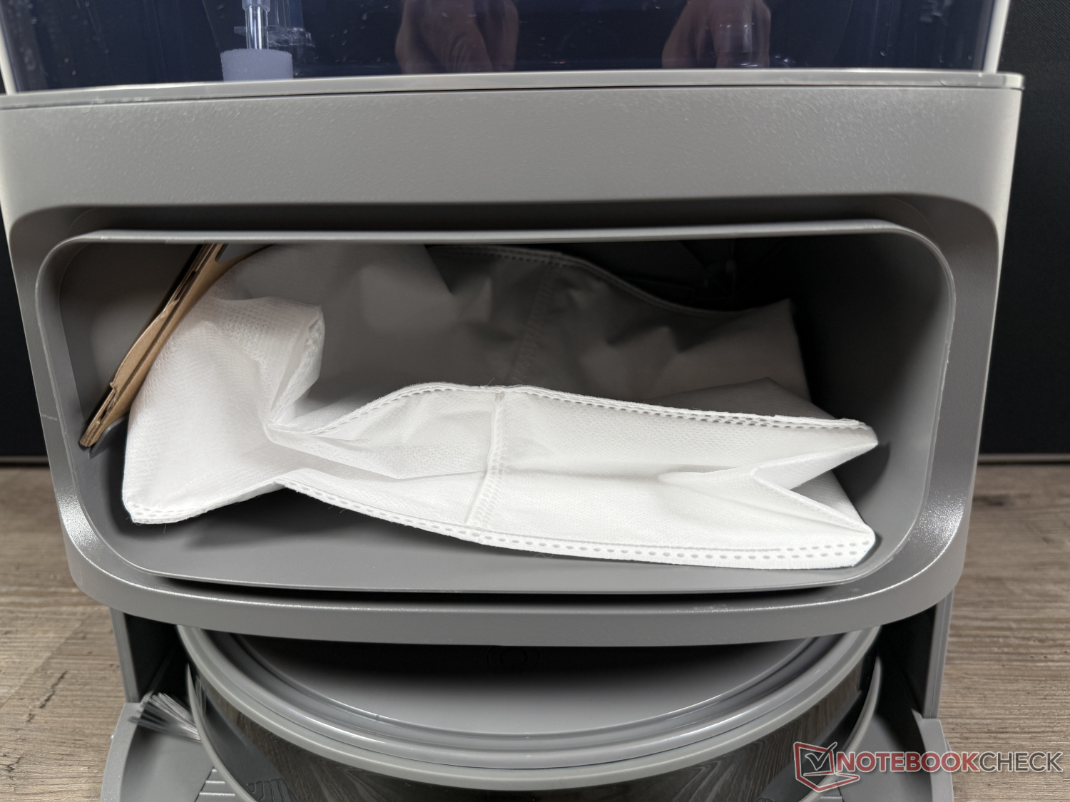 Kare tasarımlı gri baz istasyonu, parlak plastiğiyle biraz "ucuz" görünse de yaklaşık 36 cm yüksekliğiyle kompakttır. Bir toz torbasına emme fonksiyonunun yanı sıra paspas ünitesinin 45°C temperlenmiş suyla temizlenmesi, otomatik deterjan dağıtıcısı ve ardından hava akışıyla kurutma özelliğine sahiptir.