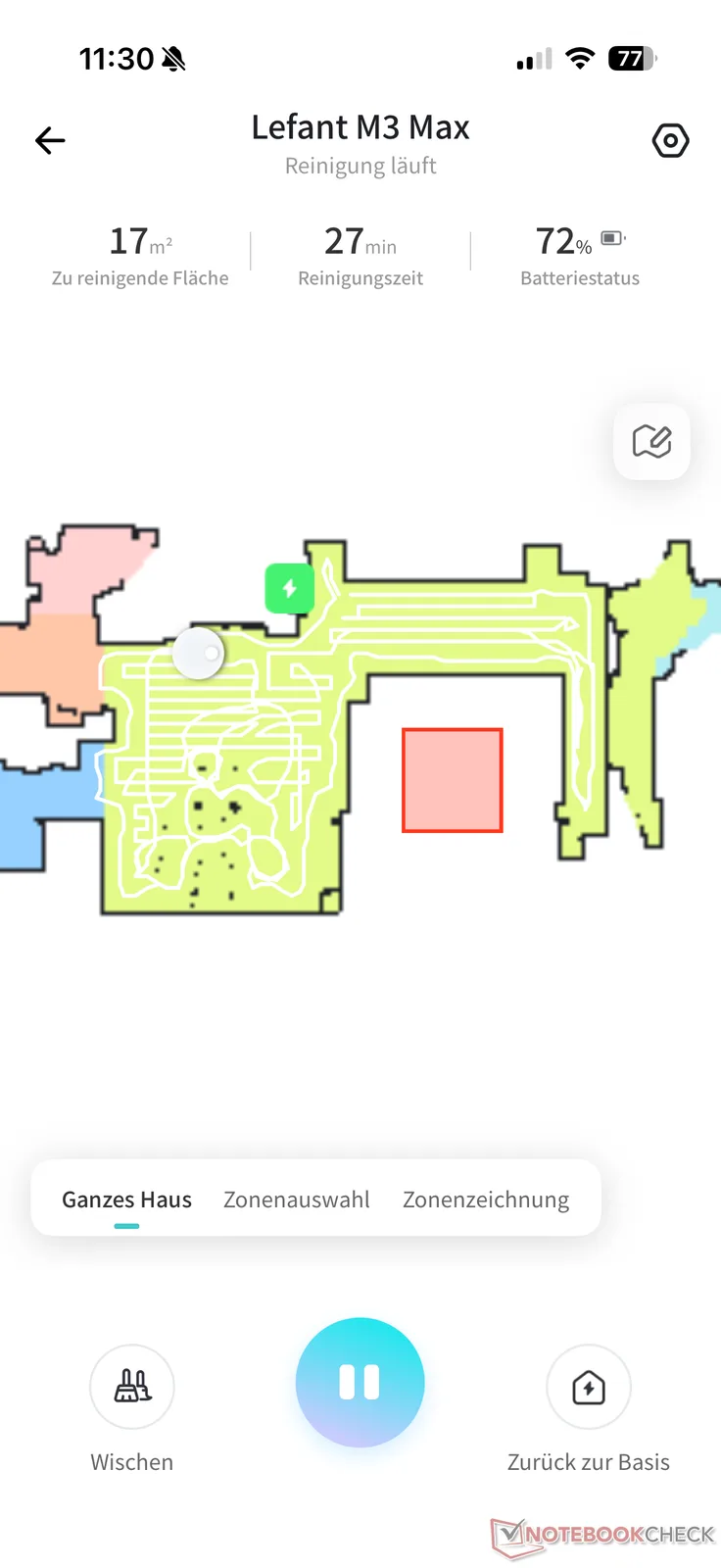 Lefant uygulaması da iyi, ancak kapsamlı olmayan bir temizlik seçenekleri yelpazesi sunuyor. Robot sadece süpürme ve paspaslama yapabiliyor, sadece paspaslama yapamıyor. Emiş gücü dört kademede ayarlanabiliyor. Paspaslama nemi, robotlar yeniden ıslatmak için istasyona dönene kadar sadece bireysel aralıkların uzunluğu ile ayarlanabilir. Pratik: Her oda için ayar "Özel" altında ayrı ayrı yapılabilir.