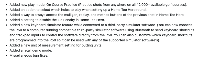 Yazılım sürümü 4.80 ile Approach R50 kullanıcıları bir dizi yeni özellik kazanıyor. Yeni bir oyun modu olan On Course Practice, 42.000'den fazla golf sahasında çeşitli atışları denemenize olanak tanıyor. Kullanıcılar artık Home Tee Hero turu sırasında hangi çukurda oynayacaklarını seçebiliyor ve bu modda Lie Penalty özelliğini devre dışı bırakabiliyor. Ayrıca, kullanıcılar artık Home Tee Hero'da bir önceki vuruşun mulligan, replay ve metrics düğmelerine erişebilirler.