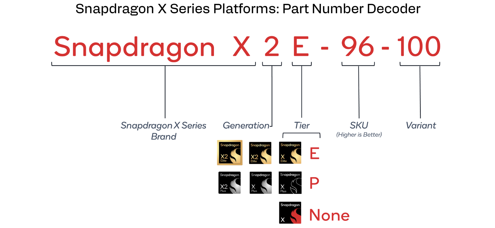 Yeni Snapdragon X2 nesli en güçlü versiyonlarla başlıyor ve Snapdragon X2 Elite yongalarına ek olarak X2 Elite Extreme işlemcileri de alıyoruz. İsimlendirme ilk nesil için zaten oldukça kafa karıştırıcıydı ve şimdi daha kolay değil. Aşağıdaki iki resim işlemcinin yanı sıra grafik adaptörünün isimlendirmesini ve anlamlarını göstermektedir.