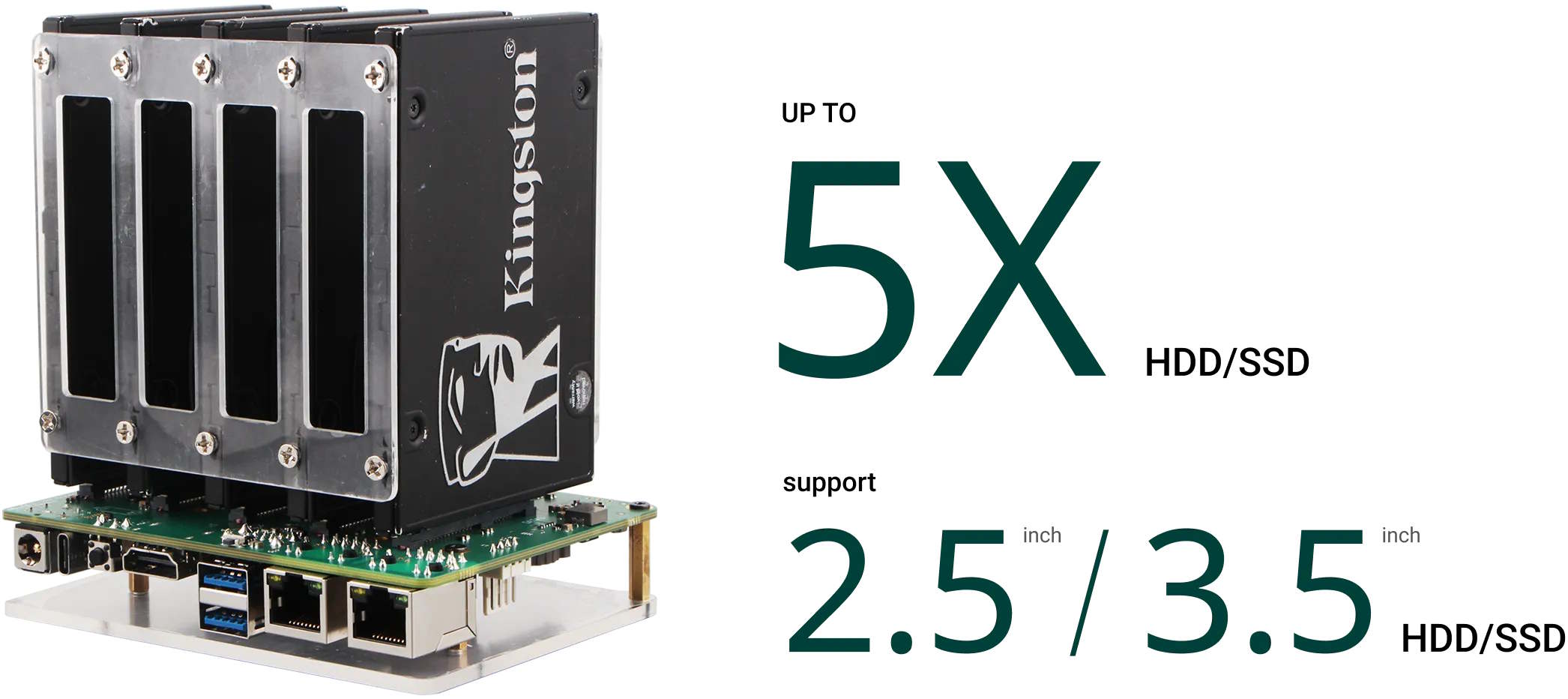 Bir microSD kart yuvası da dahildir ve genellikle işletim sisteminin yükleneceği yer burasıdır. Bu, kullanıcılara büyük ölçüde esneklik sağlar, ancak işletim sistemini kendileri yüklemekten ve güncellemekten de sorumludurlar. RAID 0, 1, 5 ve 10 desteklenmektedir. GPIO başlıkları mevcuttur. İki adet USB 3.2 Gen 1 bağlantı noktası da harici depolama cihazlarının bağlanmasına olanak tanır.