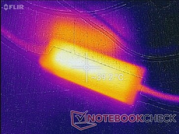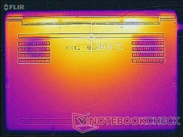 Surface temperatures are slightly warmer than what we recorded on the Ice Lake Blade Stealth. When running high loads for extended periods, hot spots on the top and bottom can be as warm as 34 C to 38 C and 40 C to 43 C, respectively. Temperature gradient is otherwise symmetrical much like on the Blade Stealth. The warmth is noticeable but not distracting since the hot spots are toward the rear away from the palm rests and most of the keyboard keys.