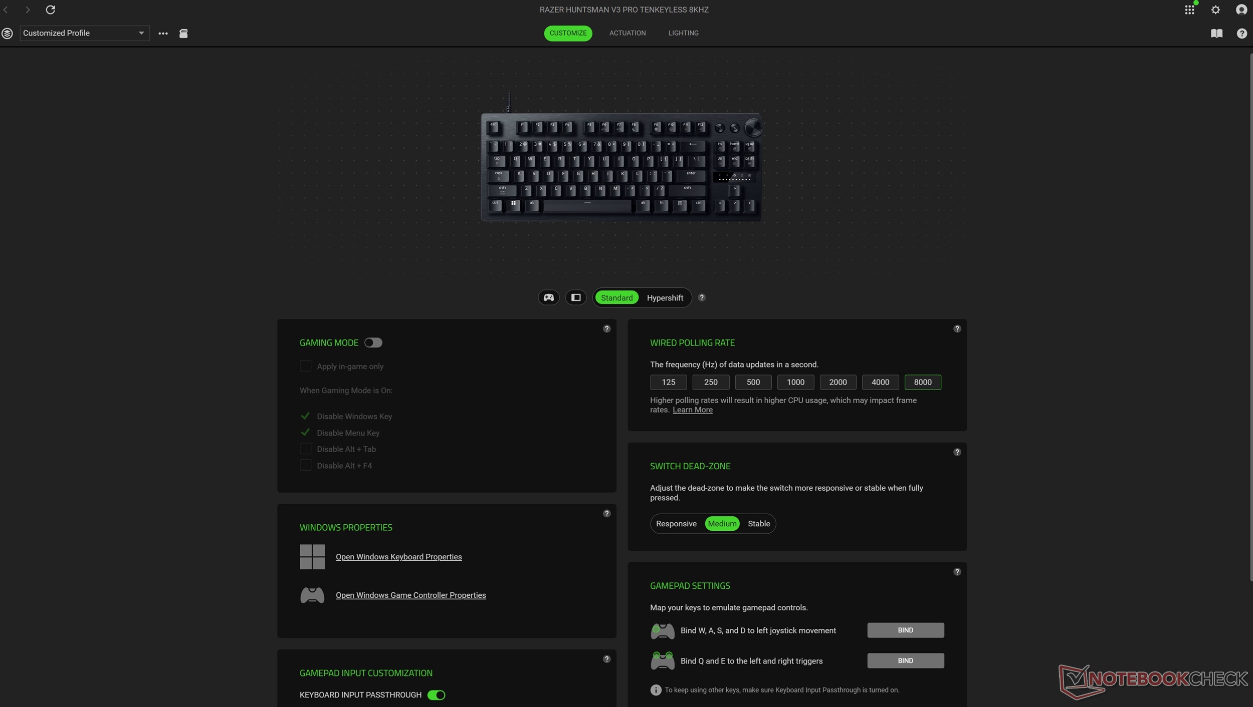 Güncellenmiş Huntsman özelliklerle dolu, bu da Synapse'in menülerinde gezinmeyi göz korkutucu hale getirebilir. Buna rağmen Razer uygulamayı üç sekmeye ayırmayı başarmış: Özelleştir, Çalıştırma ve Aydınlatma. Özelleştirme, oyuncuların yoklama oranını ayarlamasına veya Oyun Modu gibi seçenekleri açıp kapatmasına olanak tanır.