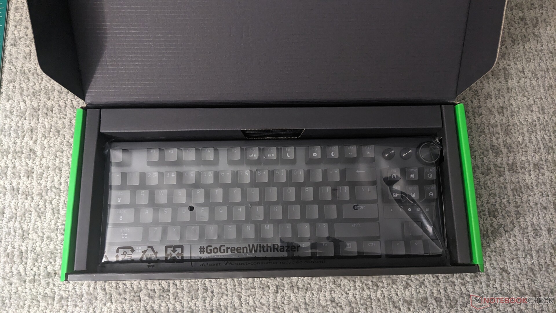 En yeni Razer klavye siyah-yeşil dikdörtgen bir kutu içinde gönderiliyor. Alıcılar kutunun içinde çıkarılabilir örgülü USB Tip A'dan Tip C'ye kablo, manyetik deri bilek desteği ve hızlı başlangıç kılavuzu bulacaklar.