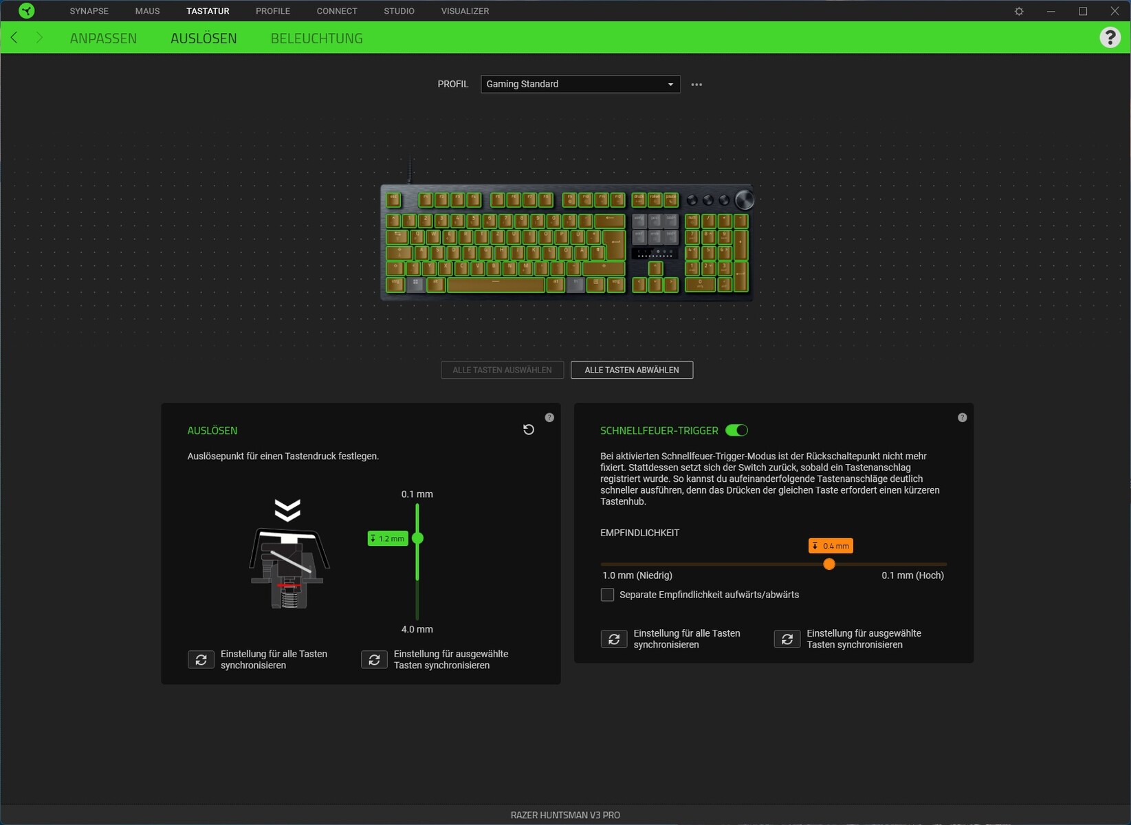Synapse yazılımının Tetikleme sekmesinde, tuş vuruşları için tetikleme noktası, varsayılan ayar 1,2 mm olmak üzere, tek tek tuşlar veya tüm klavye için 0,1 ile 4,0 mm arasında ayarlanabilir. Son derece hızlı tuş vuruşları için tuş vuruşlarını basıldıktan hemen sonra sıfırlayan Hızlı Tetikleme özelliği de burada 1,0 mm ila 0,1 mm arasında yapılandırılabilir. Bu ayarlar Windows, Fn, Insert, Delete, Pos1, End ve Page up/down tuşları hariç tüm tuşlar için kullanılabilir.