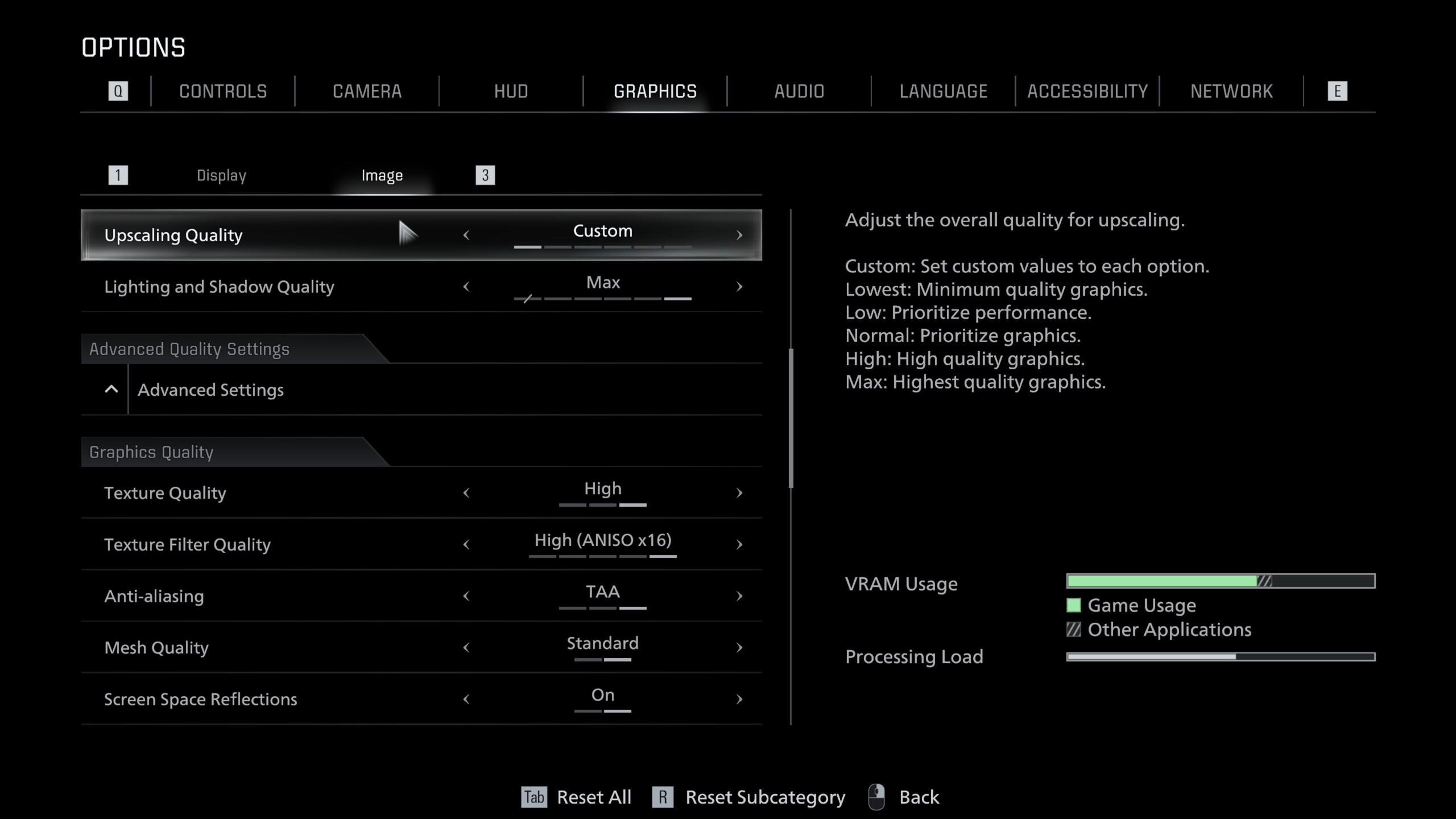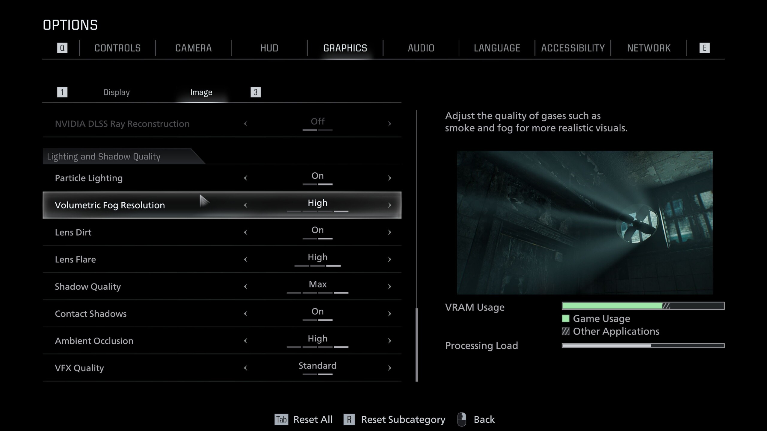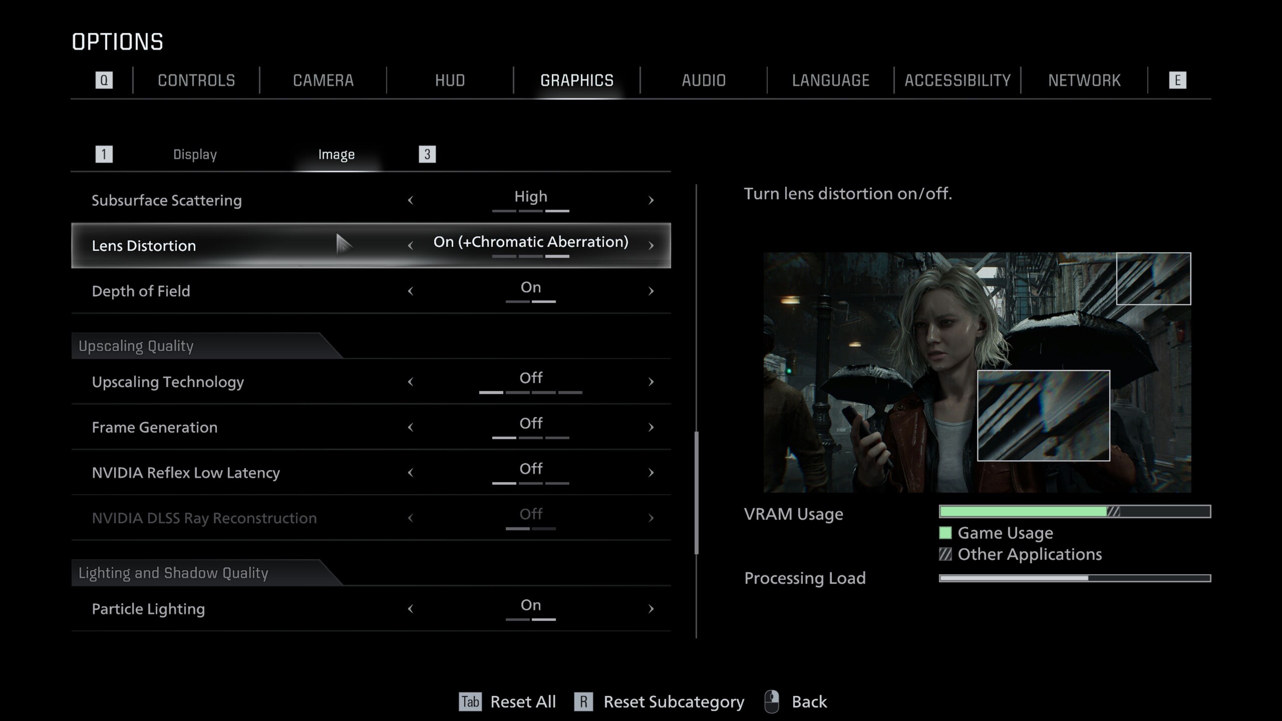 Resident Evil Requiem, modern özelliklerle dolu Capcom'un kendi RE Motoru üzerine inşa edilmiştir. Son derece ayrıntılı grafik menüsü, ekran görüntülerinde gösterildiği gibi Ekran ve Görüntü sekmelerine ayrılmıştır. Sadece DLSS, FSR ve kare oluşturma desteği ile yükseltme seçeneklerini değil, aynı zamanda ışın izleme ve yol izleme için geçişler de içerir.