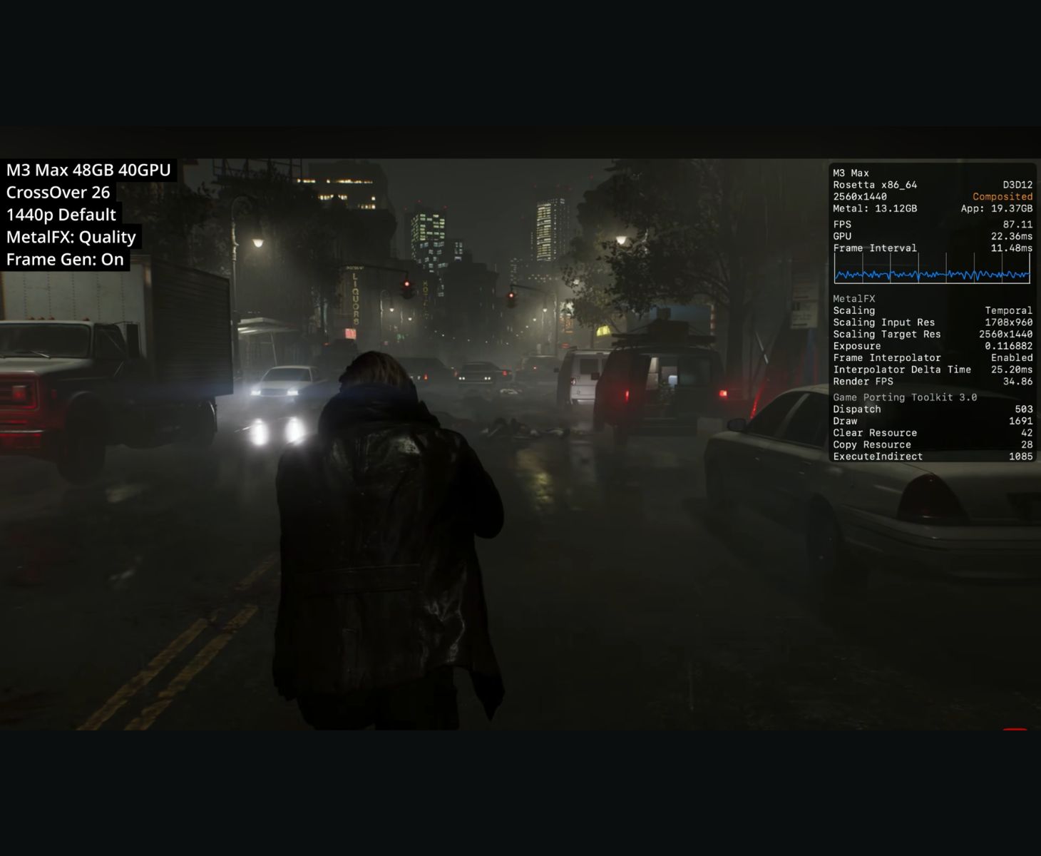 Yeni makineler çok daha iyi performans gösteriyor. Oyun bir bilgisayarda çalıştırıldı M3 Max MacBook Pro 48 GB birleşik bellek ve CrossOver 26 aracılığıyla 40 çekirdekli bir GPU ile. Varsayılan grafik ayarları, MetalFX devre dışı ve kare üretimi kapalı olarak doğal 1080p'de, sistem açık bir sokak sahnesinde yaklaşık 70 FPS'yi koruyarak donanımın yükseltmeye güvenmeden oyunu rahatça idare edebileceğini gösterdi. Bindirme ayrıca oyunun Apple'un Game Porting Toolkit katmanında yaklaşık 14 ms kare süresiyle çalıştığını ve yaklaşık 10,5 GB GPU belleği kullandığını gösteriyor.