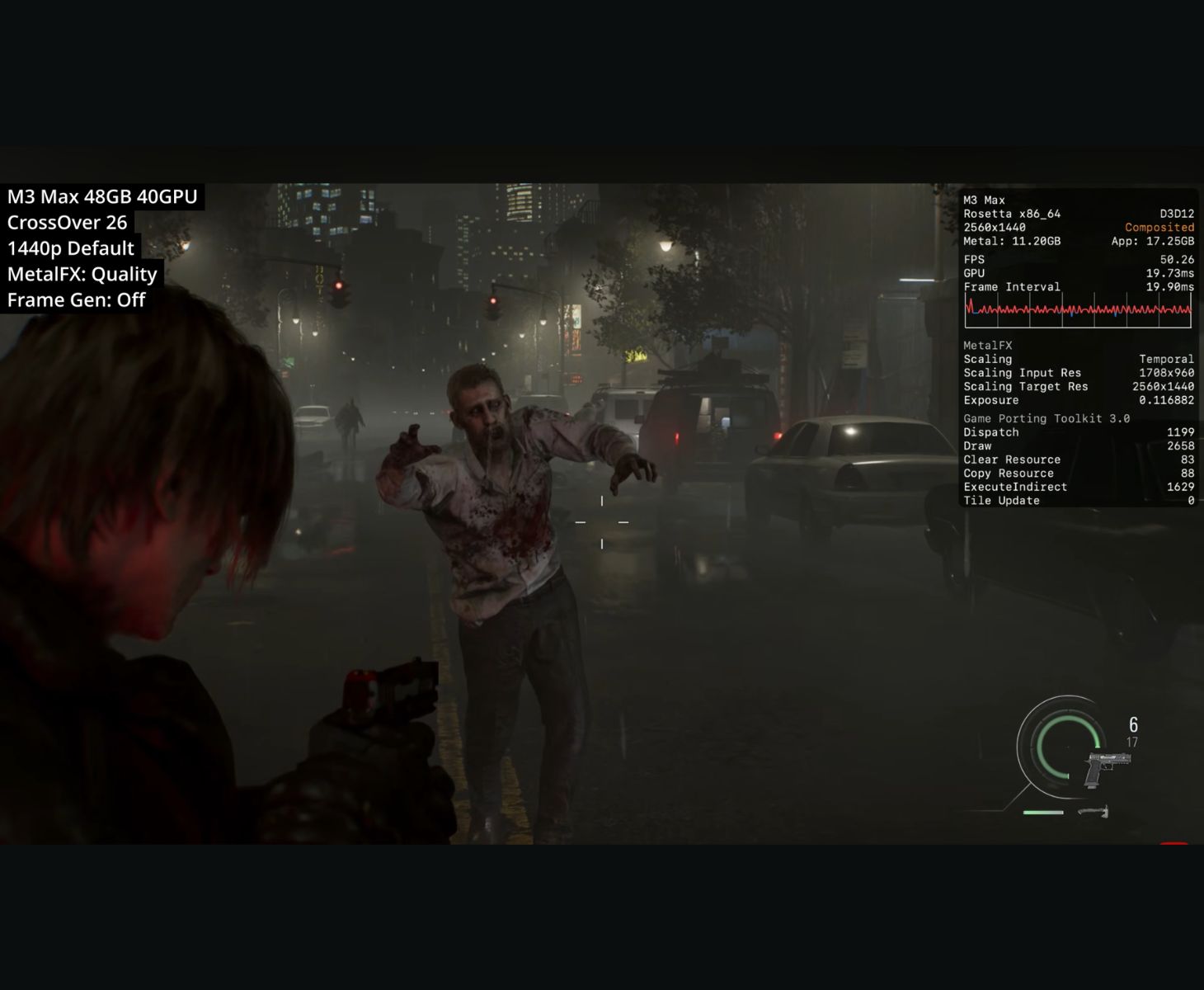 MetalFX Kalite yükseltme kullanılarak 1440p'de yapılan ayrı bir test, oyunun yaklaşık 50 FPS'de çalıştığını ve kare sürelerinin 19-20 ms'ye yakın olduğunu gösteriyor. MetalFX, 2560 × 1440'a ölçeklendirmeden önce 1708 × 960'ta dahili olarak işleme yaparak Kalite'ye ayarlanırken kare oluşturma devre dışı bırakılıyor. Yer paylaşımında ayrıca yaklaşık 11,2 GB GPU bellek kullanımı ve 17,2 GB civarında uygulama belleği görülüyor.