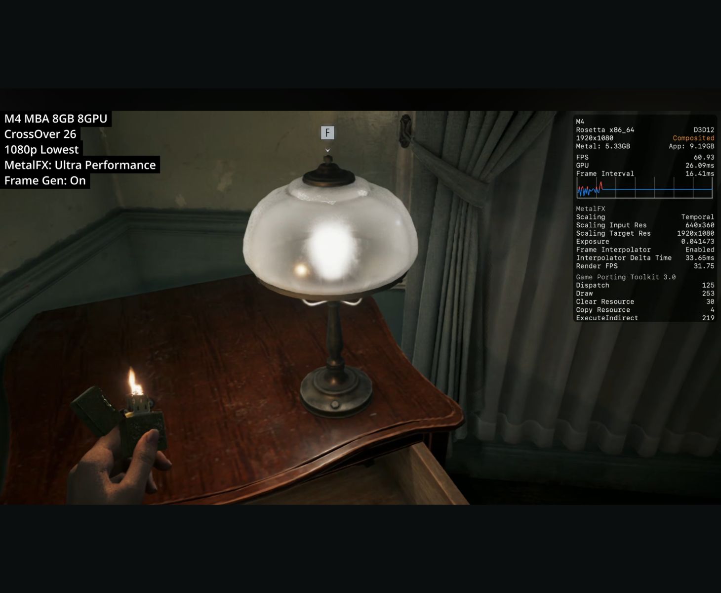 Daha uygun fiyatlı M4 çip ile güçlendirilmiş MacBook Airoyun yine de bazı ayarlamalarla çalışabilir. Oyun en düşük grafik ön ayarıyla 1080p'ye ayarlanırken, MetalFX Ultra Performans yükseltme ve kare oluşturma etkinleştirildi. Bu yapılandırmada oyun, 16 ms'ye yakın kare süreleriyle yaklaşık 60 FPS'ye ulaşıyor. Yer paylaşımı ayrıca yaklaşık 31-32 FPS'lik bir render FPS'si gösteriyor, bu da kare oluşturmanın nihai kare hızını artırmaya yardımcı olduğunu gösteriyor. GPU bellek kullanımı 5,3 GB civarındayken uygulama belleği yaklaşık 9,1 GB.