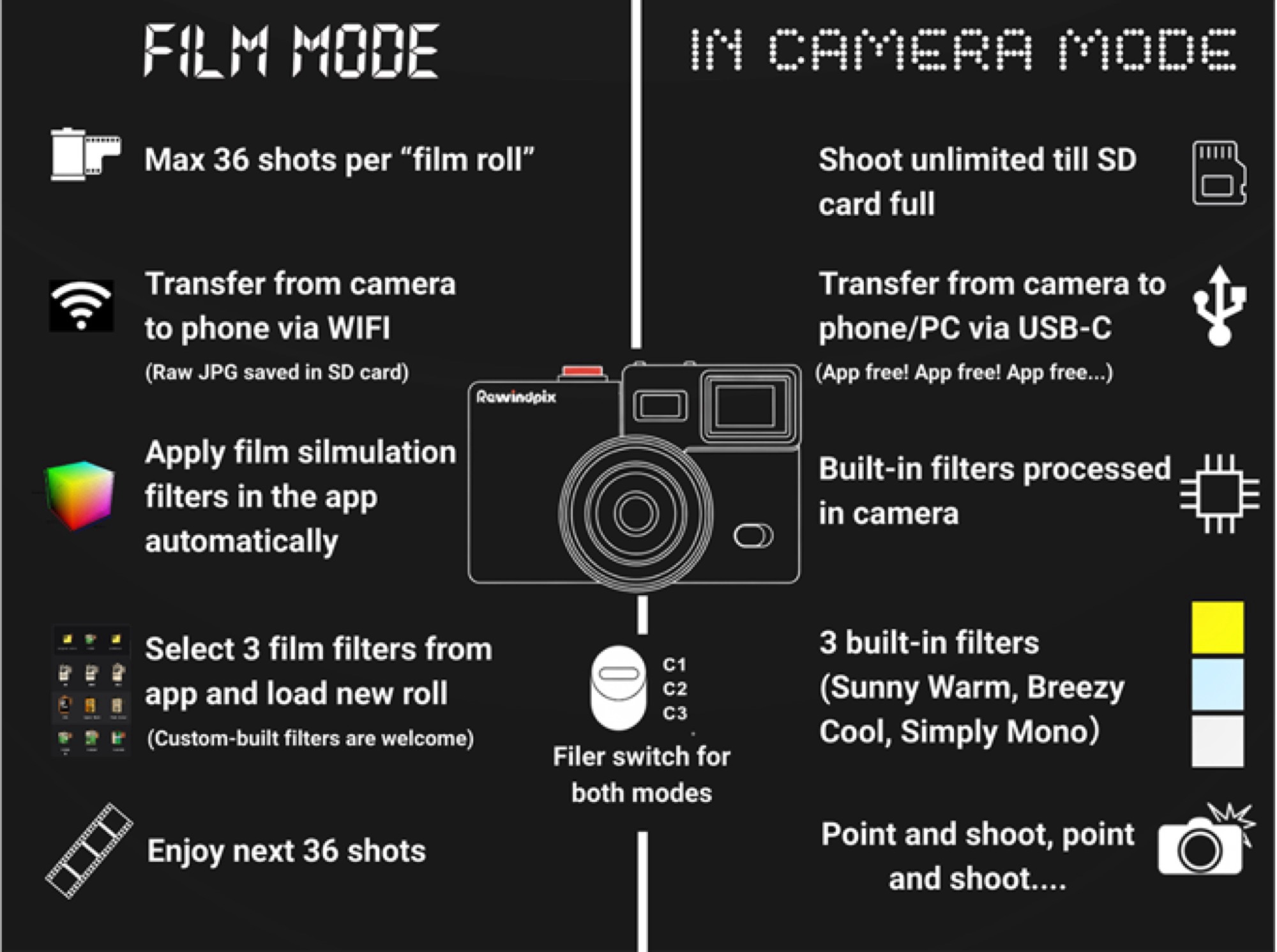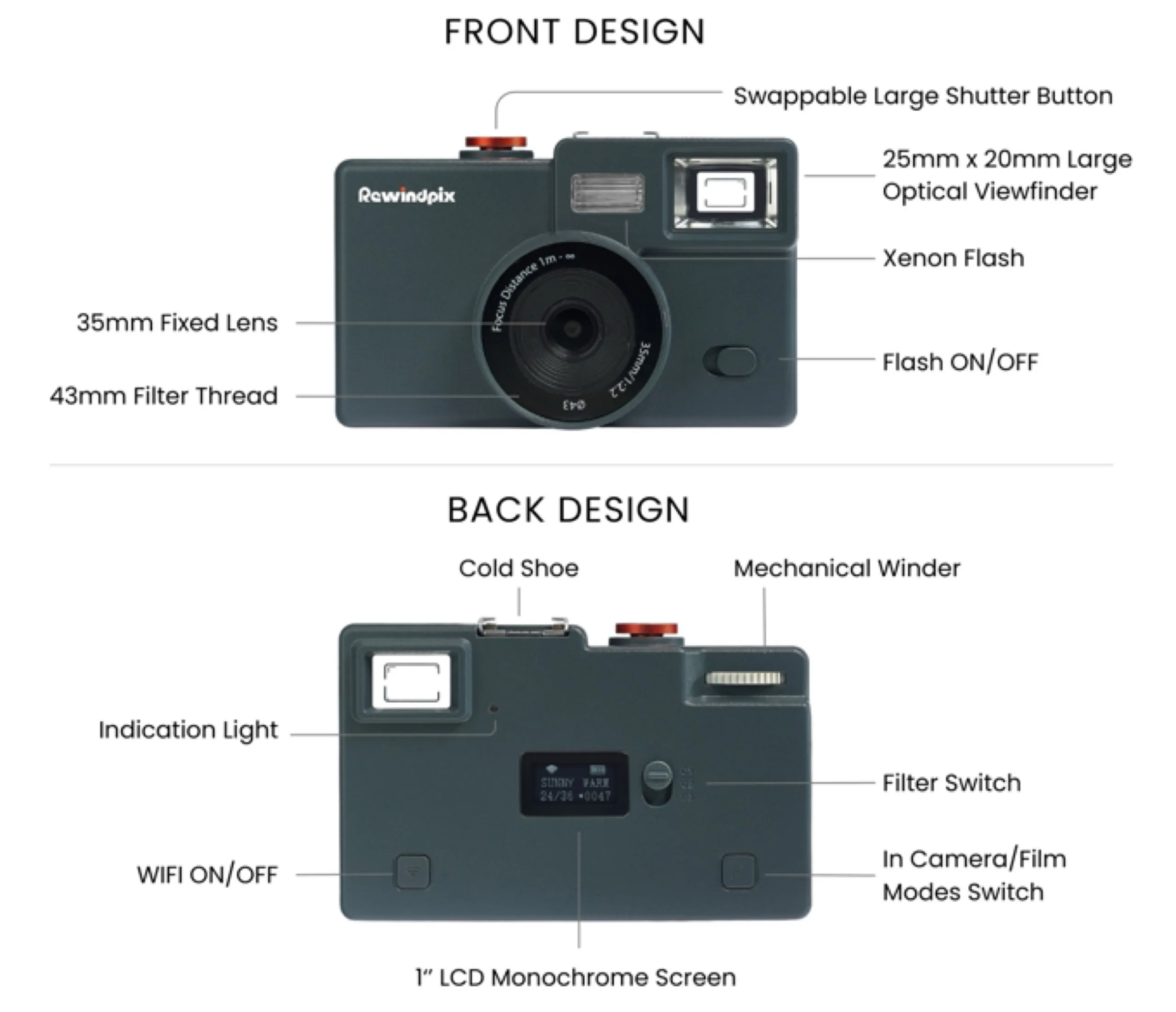 Kodak Charmera'nın büyük bir ticari başarı elde etmesinin ardından Rewindpix bu başarının üzerine bir şeyler koymaya çalışıyor. Fiyatı 119 dolar olan kamera biraz daha pahalı, ancak Rewindpix'in 35 mm f/2.2 lensle birleştirilmiş 1/3.06 inç formatında 13 megapiksel sensör kullanması nedeniyle daha iyi görüntü kalitesi elde etmesi gerekiyor.