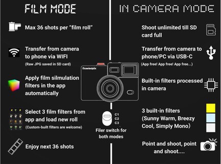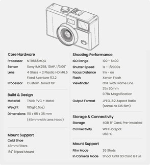 İkinci olarak, sanal film ruloları, bir filtrenin ve sınırlı sayıda fotoğrafın kilidini açan ilgili akıllı telefon uygulaması aracılığıyla eklenebilir. Fotoğraflar yalnızca film rulosunun tamamı akıllı telefona aktarıldıktan sonra görüntülenebilir, bunun için kamera Wi-Fi'yi destekler. Bu "film modu" istenirse devre dışı da bırakılabiliyor. 185 gramlık kameranın arkasındaki 1 inçlik ekran, pil ve kullanılabilir bellekle ilgili ayrıntıları gösteriyor. Teslimat kapsamına 4 GB microSD kart dahildir.