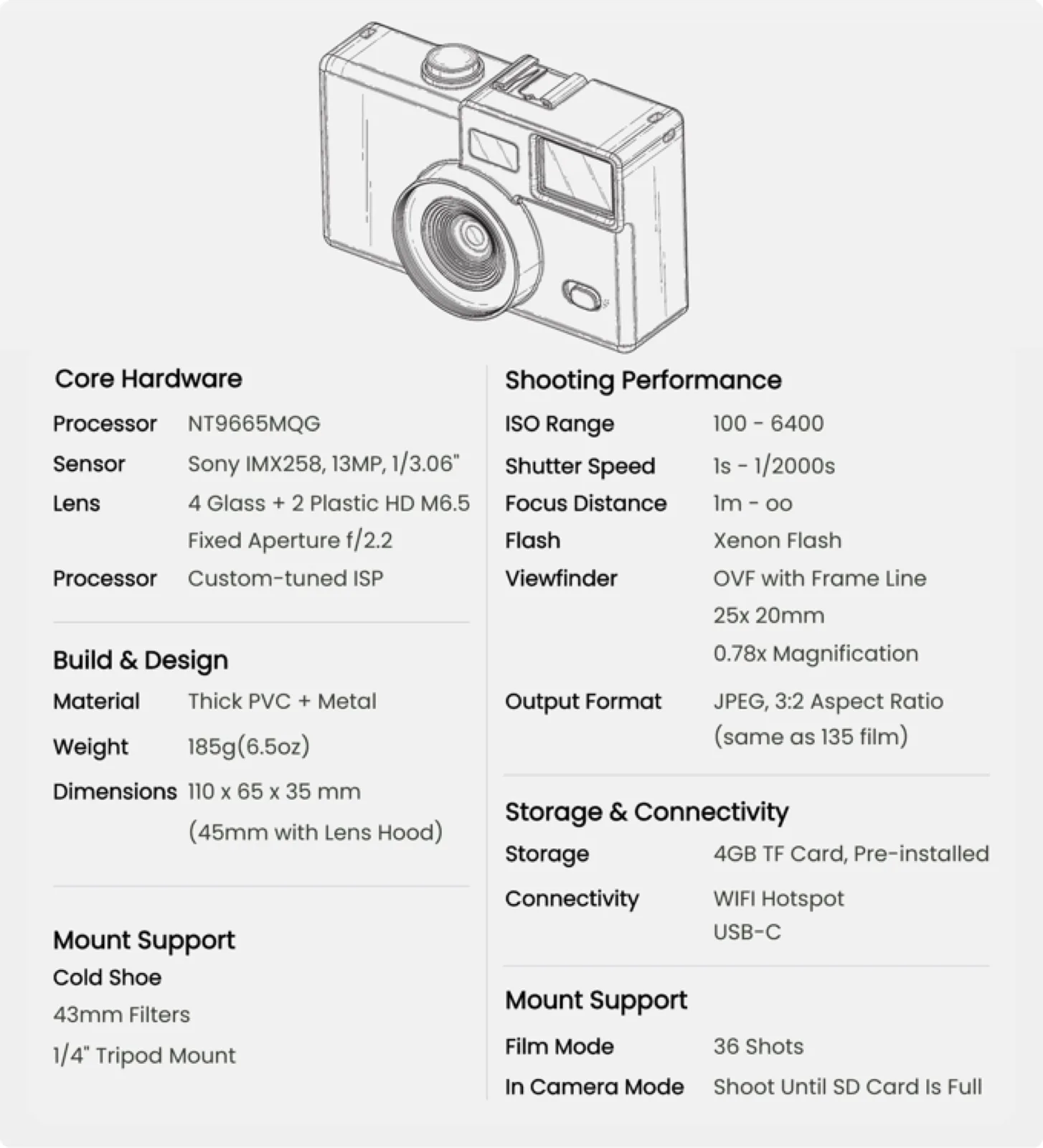 Fotoğraflar bir ekran aracılığıyla değil, büyük bir optik vizör aracılığıyla çekiliyor. Pozlama otomatik olarak ayarlanır; fotoğrafçılar yalnızca gerektiğinde flaşı açma seçeneğine sahiptir. Kamera, analog tek kullanımlık kamera hissini yakalamak üzere tasarlanmıştır. Bunu başarmak için üretici özellikle iki özel özellik geliştirdi. Birincisi, fotoğraf makinesinin her fotoğraftan sonra arkadaki tekerlek kullanılarak "sarılması" gerekiyor
