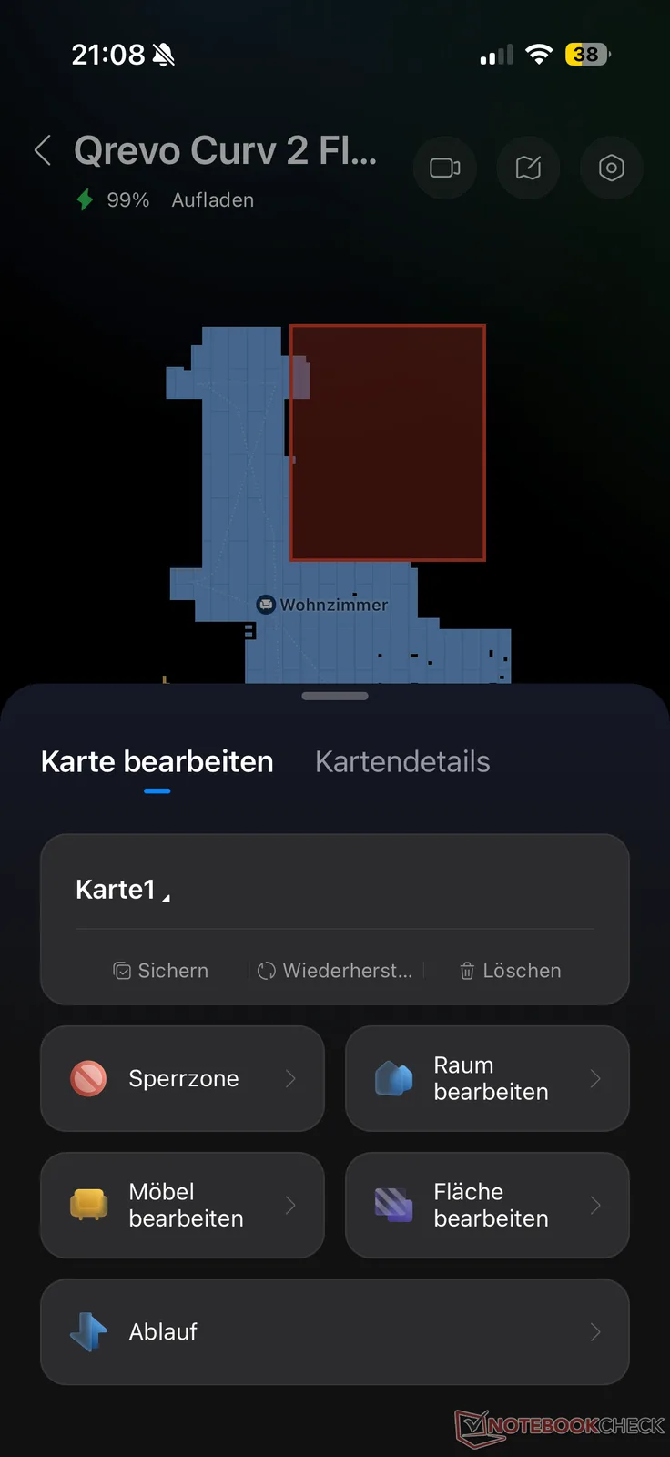 Qrevo Curv 2 Flow, çevresini güvenilir bir şekilde taradı ve birkaç dakika içinde sanal bir harita oluşturdu. Bu, uzamsal dağılım açısından zaten oldukça iyiydi. İsteğe bağlı dışlama bölgeleri de dahil olmak üzere küçük bir yeniden çalışma ile kurulum yaklaşık 10 ila 15 dakika içinde tamamlandı.