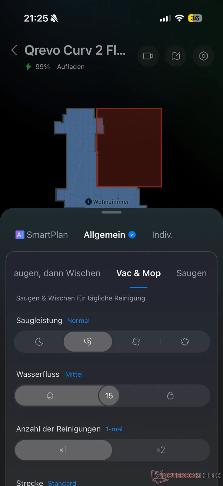 Her zamanki gibi, temizlik ayarları için birçok seçenek mevcuttur ve bunları zaten Qrevo Curv 2 Pro ve diğer Roborock modelleri. Ancak, sadece silme modunu kaçırdık. Bize göre paspaslama performansına odaklanan bir robot süpürgesi için mantıklı olan bu mod sunulmuyor. Bunun yerine, bireysel ayarlama ve otomatik AI ayarlı "AI SmartPlan "a ek olarak, Qrevo isteğe bağlı olarak "Vakumla, sonra paspasla", "Vakumla ve paspasla" ve "Vakumla" modlarını kullanabiliyor. Emiş gücü dört kademede ve paspaslama nemi 30 kademede ayarlanabilir.