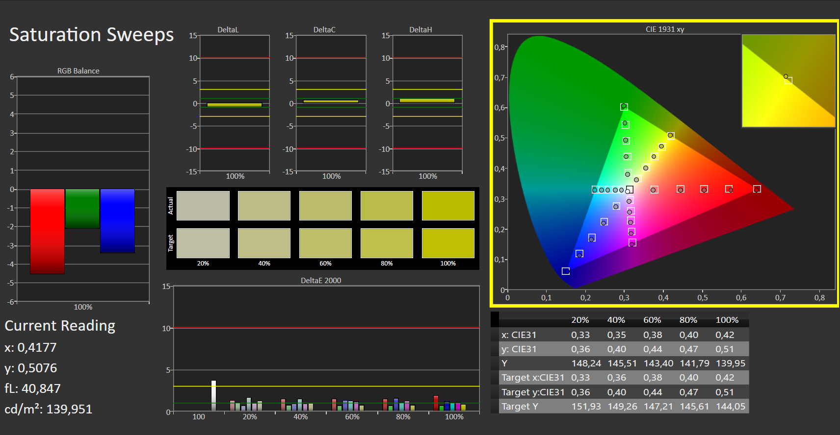 CalMAN analizi ayrıca ekranın zaten renkleri kutudan çıktığı gibi çok dengeli bir şekilde yeniden ürettiğini gösteriyor. Sonuç olarak, kalibrasyon sadece hafif bir iyileşmeye yol açar. İlgili ICC dosyası, ekranın parlaklık dağılım grafiğinin sağ üst tarafında bulunan pencereden indirilebilir.
