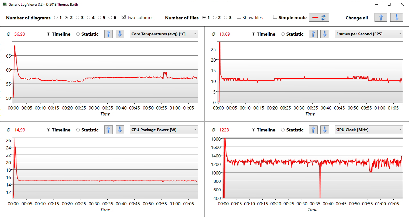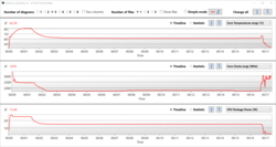 The stress test shows how the cooling system handles high permanent load. As soon as the temperatures on the SoC exceed 81 degrees (~178 degrees Fahrenheit) - which is the case after about 1:30 minutes - the clock is gradually reduced from 2500 down to 1600 MHz. The package power is also reduced from an initial 25 watts to 15 watts.