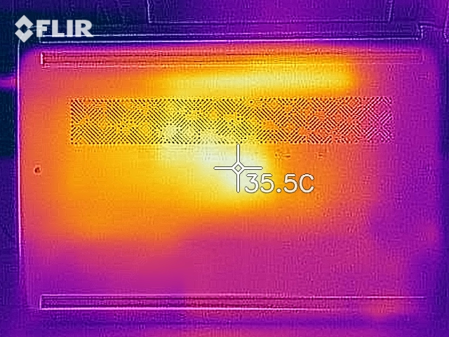 Consequently, the HP 14s favors low surface temperatures. It is only just over 60 degrees (~140 degrees Fahrenheit) on the chip permanently, which means we measured a maximum of 45 degrees (~113 degrees Fahrenheit) on the bottom, whereas the average of 30 degrees (~86 degrees Fahrenheit) is considerably lower.