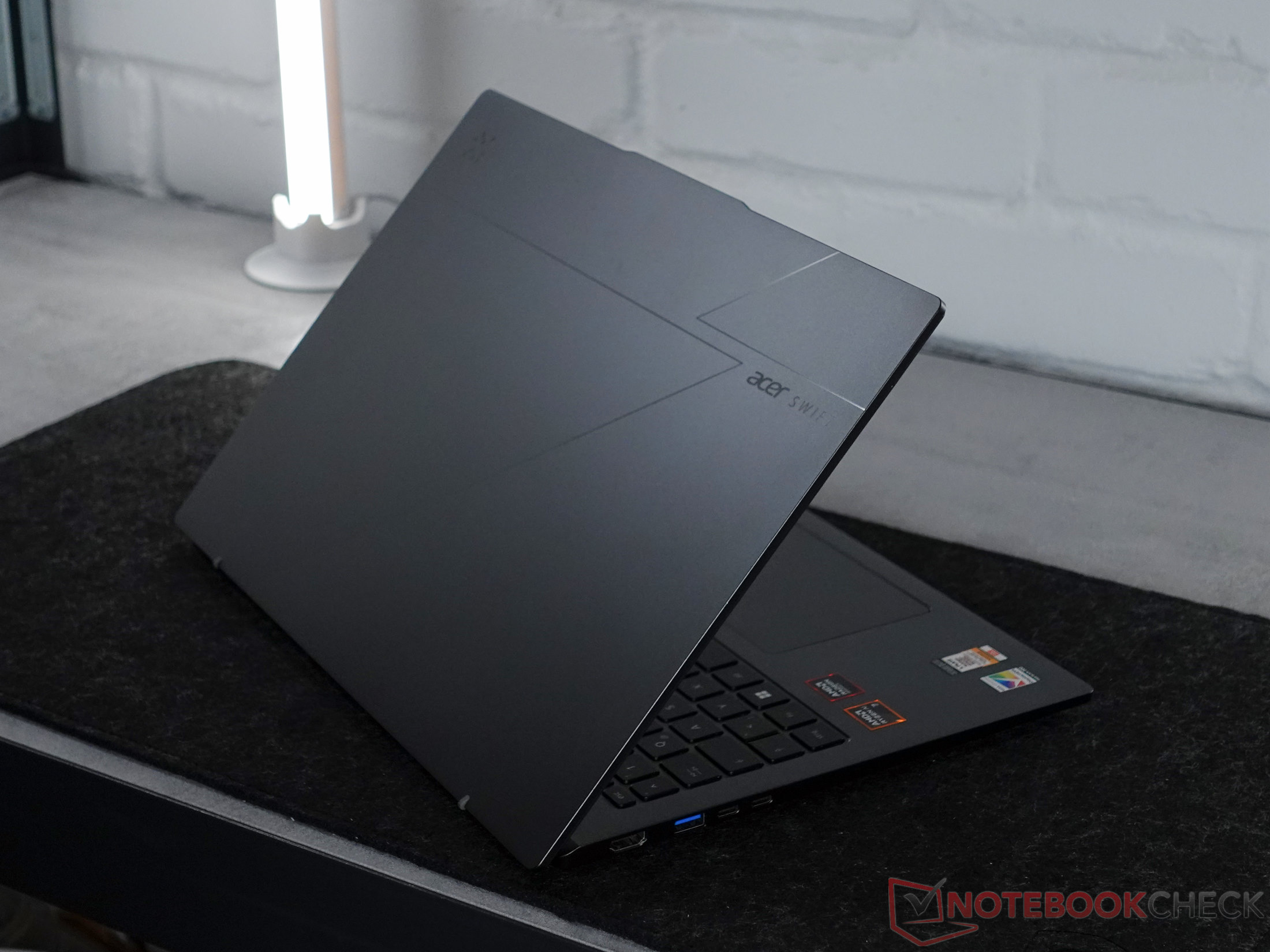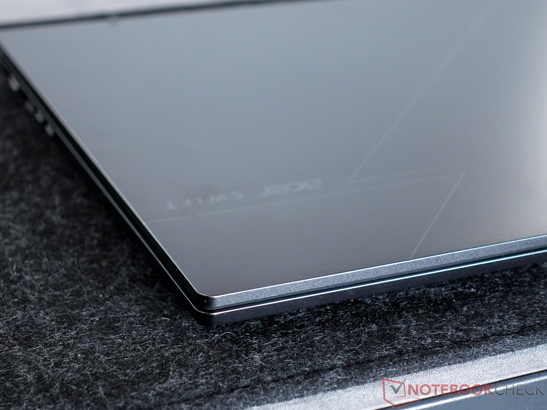 Acer Swift Go kendini şık, hafif köşeli ve alüminyumdan yapılmış olarak sunar. Ekran kapağı ince çizgiler ve ince markalarla süslenmiştir. Tek elle açıldığında, dizüstü bilgisayar arkadan hafifçe kalkıyor ve bu da ergonomiyi ve soğutmayı iyileştiriyor. Bu da dizüstü bilgisayara üst düzey bir görünüm kazandırıyor.