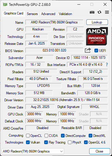 Acer, Swift Go AI için çeşitli donanım konfigürasyonları sunuyor. Test cihazımız AMD Ryzen AI 7 350 işlemci ve güçlü işlemci göz önüne alındığında biraz sınırlı görünen 16 GB RAM ile donatılmıştır.