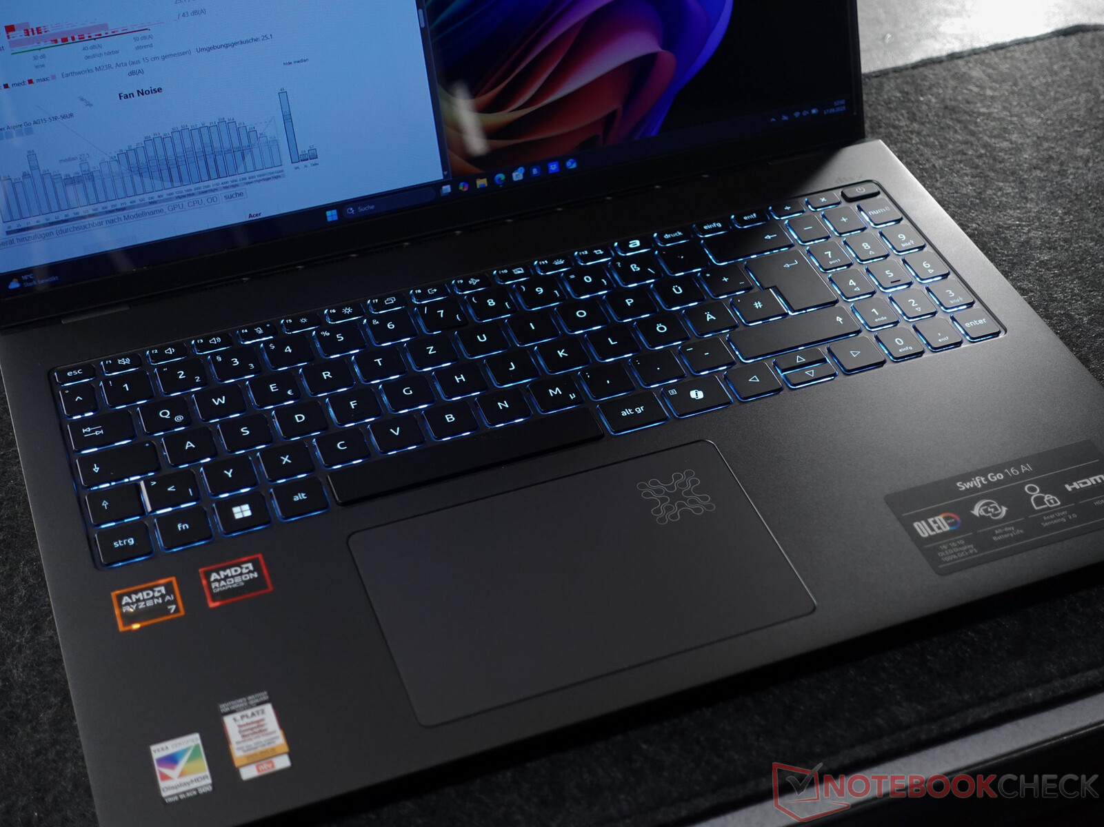 Swift Go 16 AI'nın klavyesi, özel bir sayı bloğu da dahil olmak üzere eksiksiz bir düzen sunar. Arka aydınlatma ve hoş, iyi tanımlanmış basınç noktaları bu tuşların ayırt edici özellikleridir. Cömertçe boyutlandırılmış dokunmatik yüzey hassas bir şekilde çalışır. Özel bir özellik olarak, işlemcinin NPU'su (Nöral İşlem Birimi) veya diğer AI işlevleri aktif olarak kullanıldığında ince ışık efektleriyle sinyal verir.