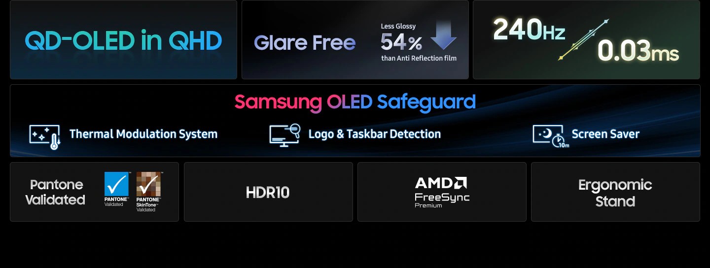 Son Samsung OLED monitörler gibi, DCI-P3 renk gamının %99'unu kapsamakla kalmıyor, aynı zamanda Pantone Validated ve Pantone SkinTone Validated özelliklerine de sahip, böylece kutudan çıkar çıkmaz doğru renkler elde ediyorsunuz. Diğer öne çıkan özellikler arasında parlama önleyici kaplama, OLED Care özellikleri ve tamamen ergonomik bir stand yer alıyor.